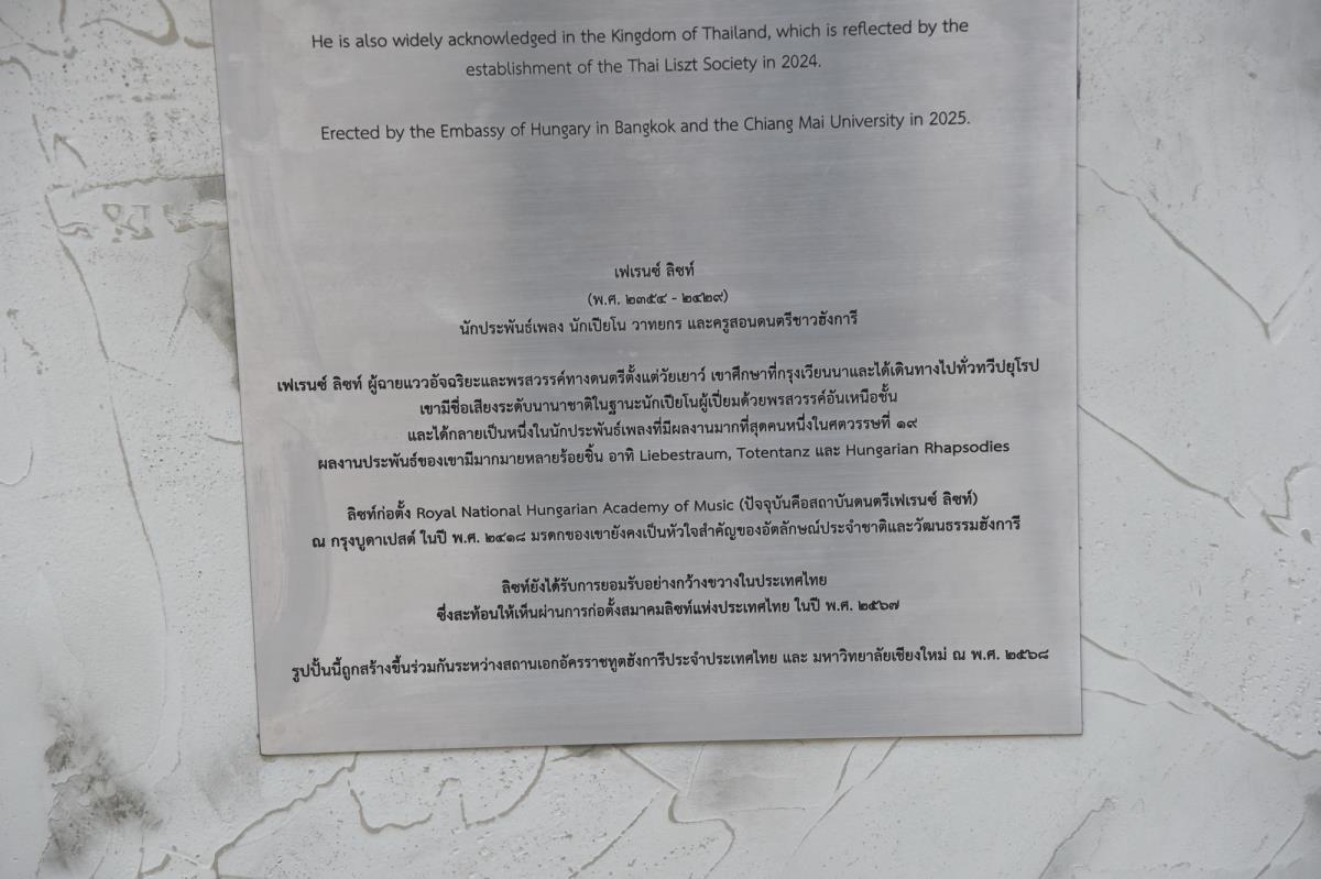 มหาวิทยาลัยเชียงใหม่ ร่วมกับสถานเอกอัครราชทูตฮังการี ประจำประเทศไทย จัดพิธีติดตั้งรูปปั้น ฟรานซ์ ลิซท์ (Franz Liszt) คีตกวีและนักเปียโนเอกชาวฮังการี โดยมีศาสตราจารย์ ดร.นพ.พงษ์รักษ์ ศรีบัณฑิตมงคล อธิการบดีมหาวิทยาลัยเชียงใหม่ และฯพณฯ ดร.ซิลเวีย ซาโลกี้ เอกอัครราชทูตฮังการี ประจำประเทศไทย ร่วมเปิดผ้าคลุมรูปปั้น ฟรานซ์ (เฟเรนซ์) ลิซท์ ซึ่งเป็นคีตกวี นักเปียโน และวาทยกรชาวฮังการี ผู้มีบทบาทสำคัญต่อพัฒนาการดนตรีคลาสสิกของโลกในคริสต์ศตวรรษที่ 19 มีผลงานสำคัญ อาทิ Hungarian Rhapsodies, Liebestraum และ Totentanz และเป็นผู้ก่อตั้งสถาบันดนตรีแห่งชาติฮังการีในปี ค.ศ. 1875 ซึ่งปัจจุบันคือ สถาบันดนตรีแฟเรนซ์ ลิซท์ กรุงบูดาเปสต์ เพื่อเฉลิมฉลอง 50 ปี แห่งความสัมพันธ์อันยาวนานระหว่างประเทศไทยและประเทศฮังการี และเป็นหมุดหมายสำคัญในการส่งเสริมการแลกเปลี่ยนทางวัฒนธรรม และเสริมสร้างความร่วมมืออันแน่นแฟ้นระหว่างประเทศไทยและประเทศฮังการีอย่างยั่งยืน โดยมีรองศาสตราจารย์ ดร.สุกรี เกษรเกศรา คณบดีคณะวิจิตรศิลป์ คณาจารย์ เจ้าหน้าที่ พร้อมด้วยผู้แทนจากสถานเอกอัครราชทูตฮังการี ร่วมพิธีเปิด ณ บริเวณลานกิจกรรม คณะวิจิตรศิลป์ มหาวิทยาลัยเชียงใหม่ วันจันทร์ที่ 12 มกราคม พ.ศ. 2569