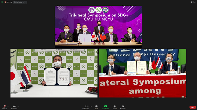 Trilateral Symposium on SDGs : Chiang Mai University (CMU) - Kagawa University (KU) - National Chiayi University (NCYU) เป็นการประชุมวิชาการนานาชาติ เกิดขึ้นจากความร่วมมือภายใต้ข้อตกลงความร่วมมือทางวิชาการ (MOUs) ระหว่างมหาวิทยาลัยเชียงใหม่ และ Kagawa University ตั้งแต่ปี พ.ศ. 2533 จากนั้นได้มีกิจกรรมความร่วมมือกันอย่างต่อเนื่อง เช่น โครงการแลกเปลี่ยนนักศึกษา โครงการแลกเปลี่ยนนักวิจัยระหว่าง 2 สถาบัน รวมถึงการเป็นเจ้าภาพร่วมการประชุมนานาชาติ คือ การประชุม “Educational Research Exchange Joint Symposium (EDUREJS)” ครั้งที่ 1 ซึ่งเริ่มเมื่อปี พ.ศ. 2550 จัดขึ้น ณ มหาวิทยาลัยเชียงใหม่ และการประชุมครั้งที่ 2 ปี พ.ศ. 2551 จัดขึ้น ณ Kagawa University ประเทศญี่ปุ่น และการประชุมครั้งที่ 3 พ.ศ. 2553 จัดขึ้น ณ มหาวิทยาลัยเชียงใหม่ จากมติที่ประชุมเมื่อปี 2551 เห็นควรให้มีการจัดประชุมดังกล่าวปีเว้นปีจวบจนปัจจุบัน ในปี พ.ศ. 2564 มหาวิทยาลัยเชียงใหม่และKagawa University ได้เชิญ National Chiayi University จากประเทศไต้หวันเข้าร่วมการประชุม เพื่อส่งเสริมให้เกิดความร่วมมือ และการแลกเปลี่ยนเรียนรู้ด้านงานวิจัย รวมถึงการต่อยอดงานวิจัย ซึ่งการประชุมในครั้งนี้ประกอบด้วย พิธีลงนามบันทึกข้อตกลงความร่วมมือทางวิชาการระหว่าง 3 สถาบัน การประชุมวิชาการนานาชาติ โดยมุ่งเน้นการนำเสนอในหัวข้อที่เชื่อมโยงกับการพัฒนาอย่างยั่งยืน (SDGs) และยุทธศาสตร์เชิงรุกและพันธกิจของมหาวิทยาลัยเชียงใหม่ โดยแบ่งเป็นการนำเสนอหัวข้อวิจัย 5 หัวข้อ ได้แก่ 1) Food Session 2) Health Session 3) Society Session 4) Technology Session 5) Student Session ซึ่งเป็นกิจกรรมแลกเปลี่ยนประสบการณ์การเรียนรู้ต่างๆ ระหว่างนักศึกษา 3 สถาบัน ภายหลังสถานการณ์การแพร่ระบาดของเชื้อโคโรน่าไวรัส COVID-19