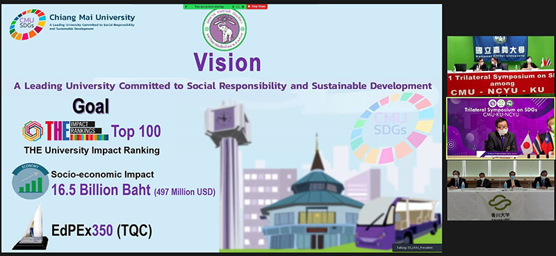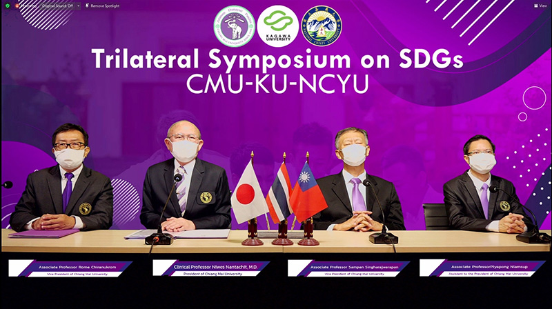 มหาวิทยาลัยเชียงใหม่ ได้เดินหน้าสู่การพัฒนาที่ยั่งยืน SDGs ด้วยการสนับสนุนการศึกษารูปแบบใหม่ ผลักดันการนำเทคโนโลยีมาพัฒนาการดำเนินงานต่างๆ เพื่อเป็นมหาวิทยาลัยแห่งนวัตกรรมต้นแบบเพื่อชุมชน และร่วมพัฒนาสังคม รวมไปถึงความร่วมมือกับสถาบันศึกษาทั้งในและต่างประเทศ เพื่อเชื่อมโยงกับการพัฒนาที่ยั่งยืน เช่นเดียวกับการประชุม วิชาการนานาชาติในรูปแบบการประชุมเสมือนจริง (Virtual Meeting) ผ่านระบบอิเล็กทรอนิกส์ “Trilateral Symposium on SDGs : Chiang Mai University (CMU) - Kagawa University (KU) - National Chiayi University (NCYU)” โดยมี ศาสตราจารย์คลินิก นายแพทย์นิเวศน์ นันทจิต อธิการบดีมหาวิทยาลัยเชียงใหม่เป็นประธานเปิดการประชุม เมื่อวันพุธที่ 1 กันยายน 2564 13.00-15.00 น.