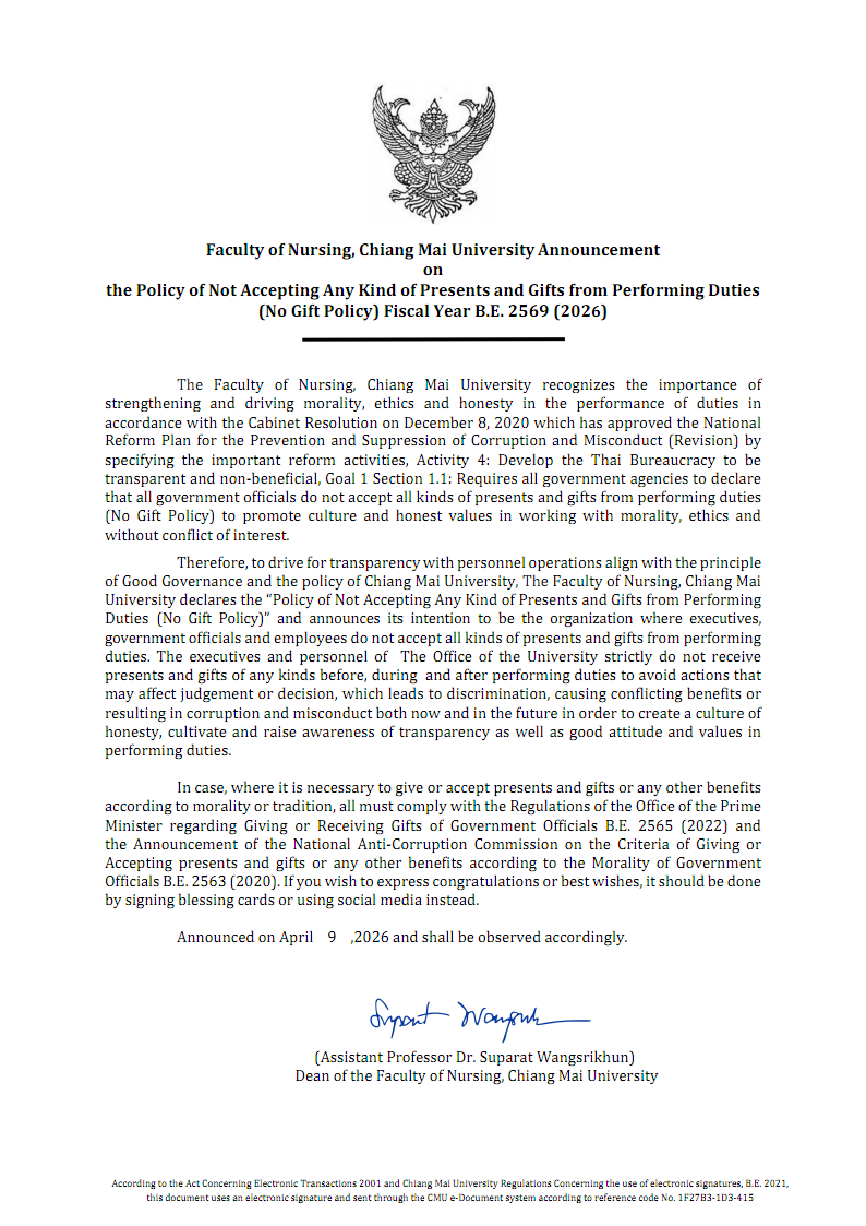 คณะพยาบาลศาสตร์ มช. ประกาศนโยบายไม่รับของขวัญหรือของกำนัลหรือผลประโยชน์อื่นใดจากการปฏิบัติหน้าที่ (No Gift Policy) ประจำปีงบประมาณ พ.ศ. 2569
