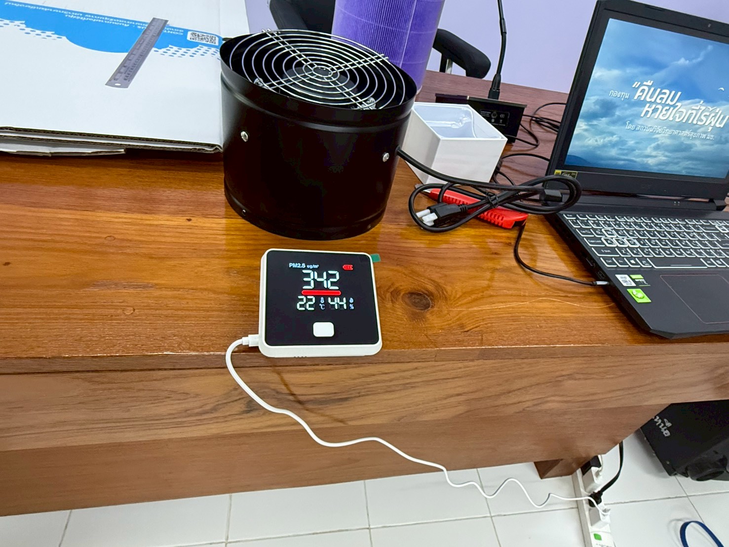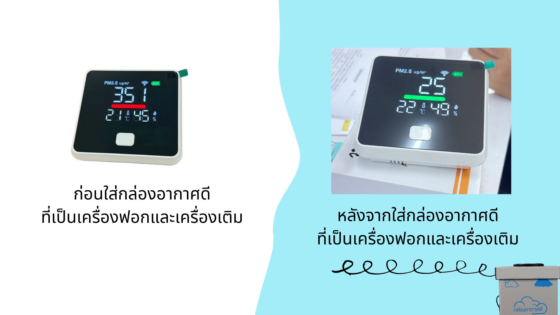 ภายหลังการประกอบเครื่องฟอกอากาศและเครื่องเติมอากาศเสร็จสิ้น ได้มีการทดลองใช้งานภายในห้องประชุม โดยพบว่า ก่อนเปิดใช้งาน “กล่องอากาศดี” ค่าฝุ่น PM2.5 ภายในห้องอยู่ที่ 351 ไมโครกรัมต่อลูกบาศก์เมตร และหลังจากเปิดใช้งานเพียง 25 นาที ค่าฝุ่นลดลงเหลือ 25 ไมโครกรัมต่อลูกบาศก์เมตร แสดงให้เห็นถึงประสิทธิภาพของนวัตกรรมดังกล่าวในการลดปริมาณฝุ่น PM2.5 ได้อย่างชัดเจน**
