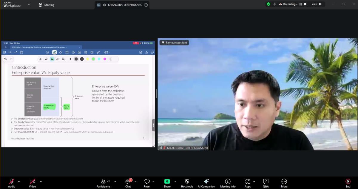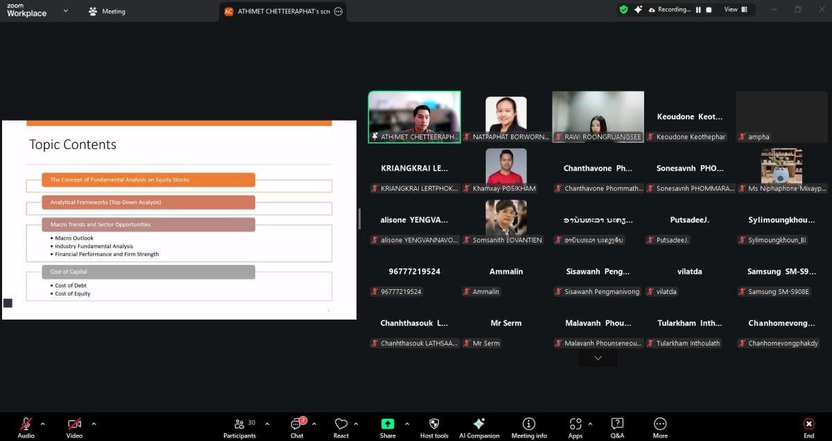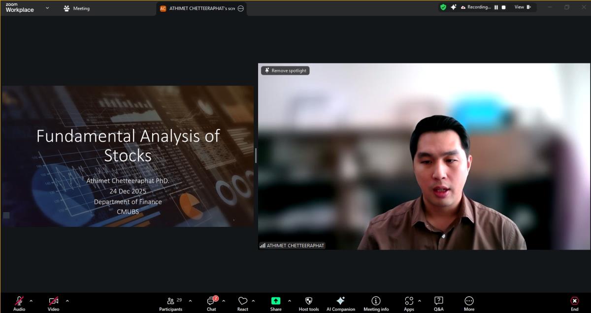 วันที่ 24 ธันวาคม 2568 คณะบริหารธุรกิจ มหาวิทยาลัยเชียงใหม่ ร่วมกับสถาบันการธนาคาร ธนาคารแห่งสาธารณรัฐประชาธิปไตยประชาชนลาว จัดการอบรมเชิงวิชาการในรูปแบบออนไลน์ หัวข้อ “Fundamental Analysis on Stock” ให้แก่บุคลากรของสถาบันการธนาคารและบุคลากรจากธนาคารต่าง ๆ ภายใต้โครงการบริการวิชาการตามกรอบความร่วมมือและการแลกเปลี่ยนระหว่างสองสถาบัน เพื่อเสริมสร้างความรู้ ความเข้าใจ และทักษะด้านการวิเคราะห์ปัจจัยพื้นฐานของหลักทรัพย์ อันเป็นองค์ความรู้สำคัญต่อการพัฒนาศักยภาพบุคลากรในภาคการเงินและการธนาคารในระดับสากล