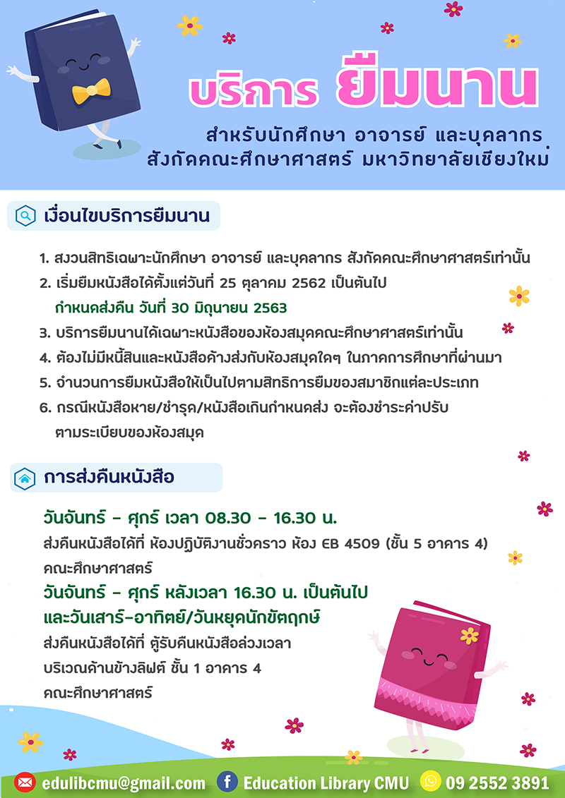ห้องสมุดคณะศึกษาศาสตร์ให้บริการยืมนาน...นาน สำหรับนักศึกษา อาจารย์ และบุคลากรคณะศึกษาศาสตร์ สามารถยืมหนังสือได้ ตั้งแต่วันที่ 25 ตุลาคม 2562 เป็นต้นไป โดยกำหนดส่งคืนหนังสือในวันที่ 30 มิถุนายน 2563