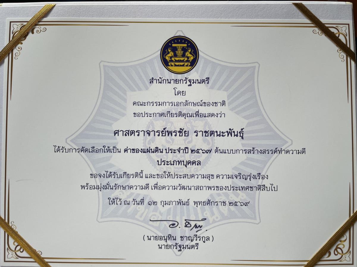 ศาสตราจารย์ ดร.พรชัย ราชตนะพันธุ์ อาจารย์ประจำคณะอุตสาหกรรมการเกษตร มหาวิทยาลัยเชียงใหม่ ได้รับการประกาศเกียรติคุณ “ค่าของแผ่นดิน” ด้านการส่งเสริมวิทยาศาสตร์และเทคโนโลยี ประจำปี พ.ศ. 2567 จาก นายอนุทิน ชาญวีรกูล นายกรัฐมนตรีและรัฐมนตรีว่าการกระทรวงมหาดไทย ประธานในพิธีมอบรางวัลประกาศเกียรติคุณ “ค่าของแผ่นดิน” ประจำปี 2567 วันที่ 12 กุมภาพันธ์ 2569 ณ ทำเนียบรัฐบาล