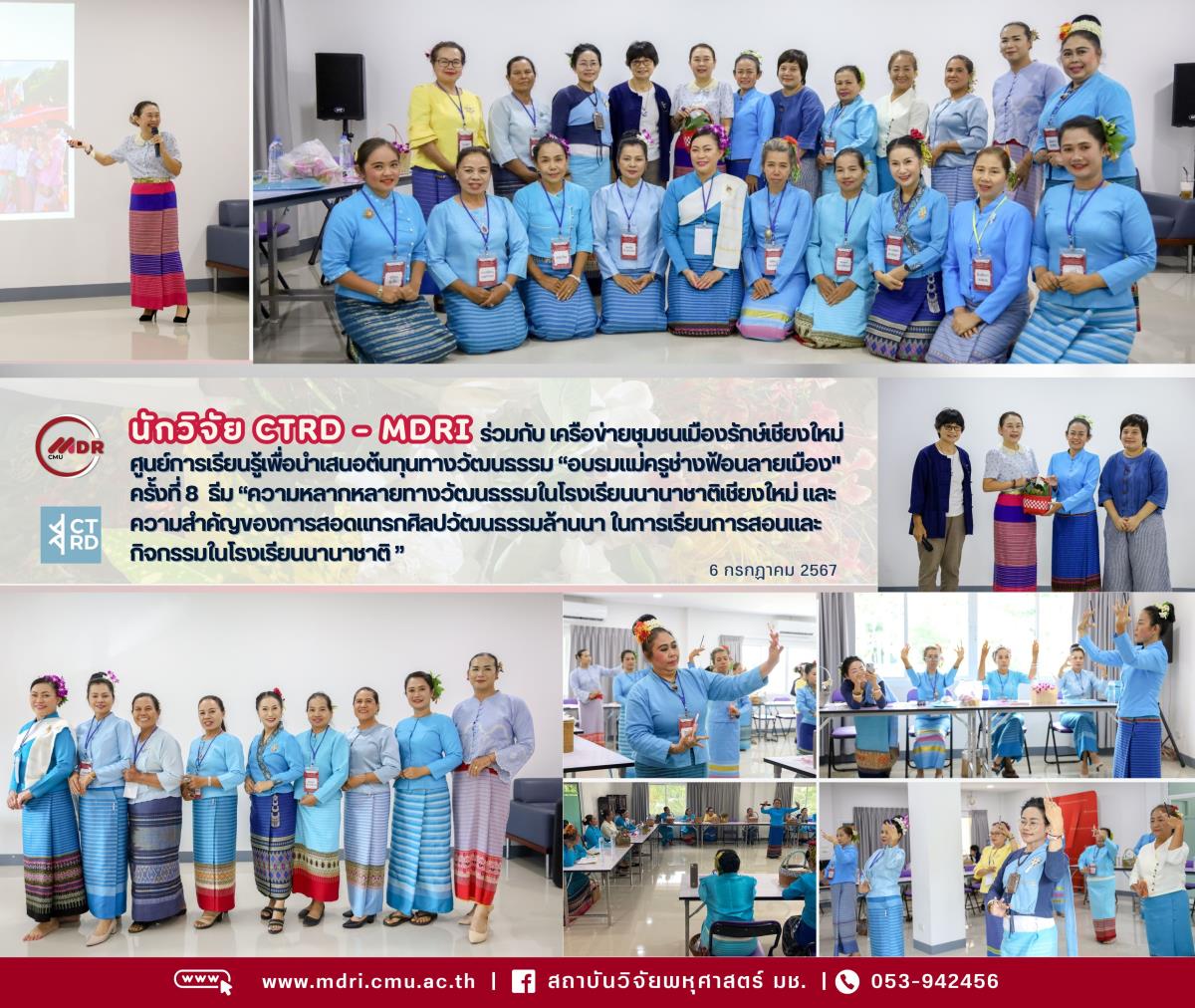 เมื่อวันเสาร์ที่ 6 กรกฎาคม 2567 ได้มีการจัดอบรมเชิงปฏิบัติการ (Workshop) เพื่อนำเสนอต้นทุนทางวัฒนธรรม “อบรมแม่ครูช่างฟ้อนลายเมือง" ครั้งที่ 8 ณ ห้องประชุมชั้น 2 สถาบันวิจัยพหุศาสตร์ มหาวิทยาลัยเชียงใหม่