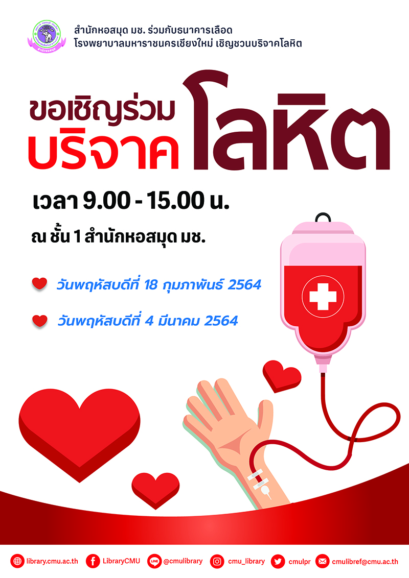 สำนักหอสมุด มหาวิทยาลัยเชียงใหม่ ร่วมกับธนาคารเลือด โรงพยาบาลมหาราชนครเชียงใหม่ จัดกิจกรรมบริจาคโลหิต เวลา 9.00 - 15.00 น. ณ บริเวณด้านหน้าบันไดกลาง ชั้น 1 สำนักหอสมุด ดังนี้