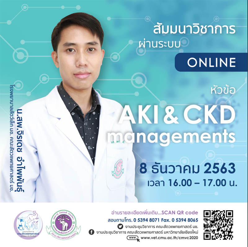 - ครั้งที่ 7 วันที่ 24 พฤศจิกายน 2563 หัวข้อ AKI & CKD diagnosis วิทยากร : ผศ.น.สพ.ดร.สหัสชัย ตั้งตรงทรัพย์ ภาควิชาคลินิกสัตว์เลี้ยงและสัตว์ป่า คณะสัตวแพทยศาสตร์ มช.