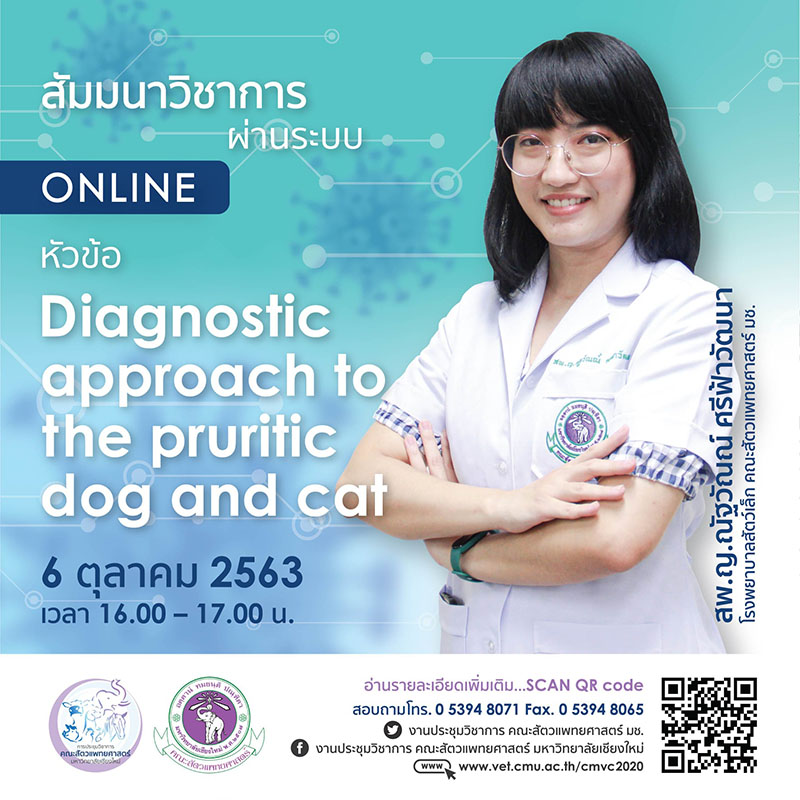 - ครั้งที่ 1 วันที่ 6 ตุลาคม 2563 หัวข้อ Diagnostic approach to the pruritic dog and cat วิทยากร : สพ.ญ.ณัฐวัณณ์ ศรีฟ้าวัฒนา โรงพยาบาลสัตว์เล็ก คณะสัตวแพทยศาสตร์ มช.