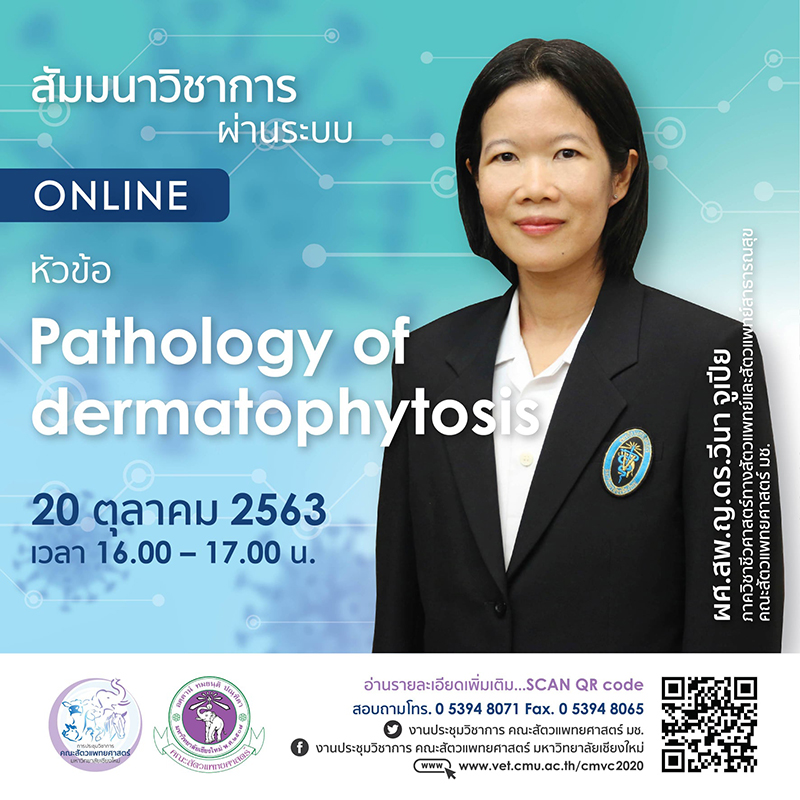 - ครั้งที่ 2 วันที่ 20 ตุลาคม 2563 หัวข้อ Pathology of dermatophytosis วิทยากร : ผศ.สพ.ญ.ดร.วีนา จูเปีย ภาควิชาชีวศาสตร์ทางสัตวแพทย์และสัตวแทพย์สาธารณสุข คณะสัตวแพทยศาสตร์ มช.