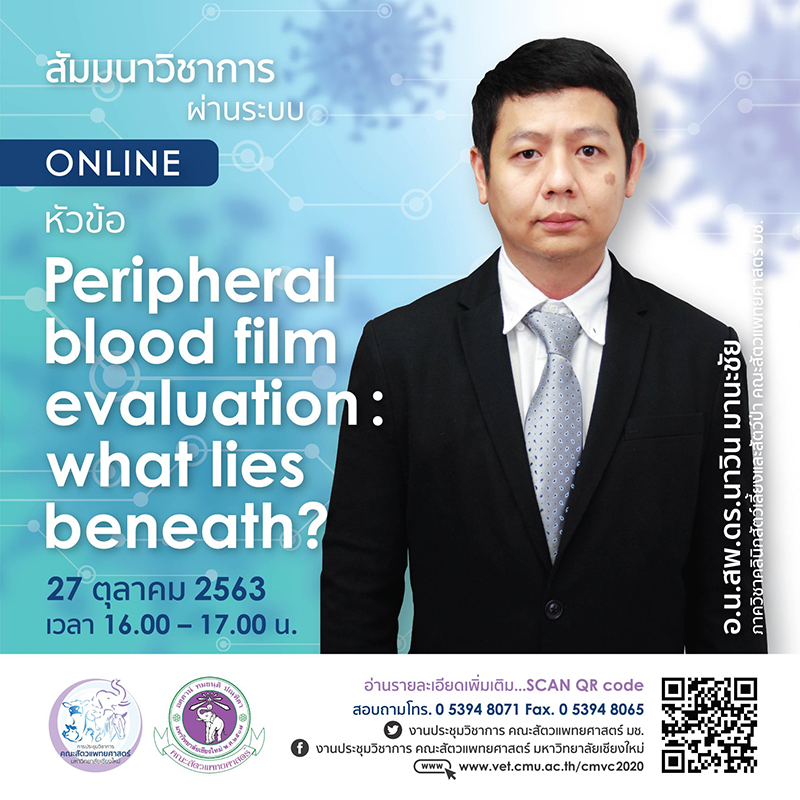 - ครั้งที่ 3 วันที่ 27 ตุลาคม 2563 หัวข้อ Peripheral blood film evaluation : what lies beneath? วิทยากร : อ.น.สพ.ดร.นาวิน มานะชัย ภาควิชาคลินิกสัตว์เลี้ยงและสัตว์ป่า คณะสัตวแพทยศาสตร์ มช.