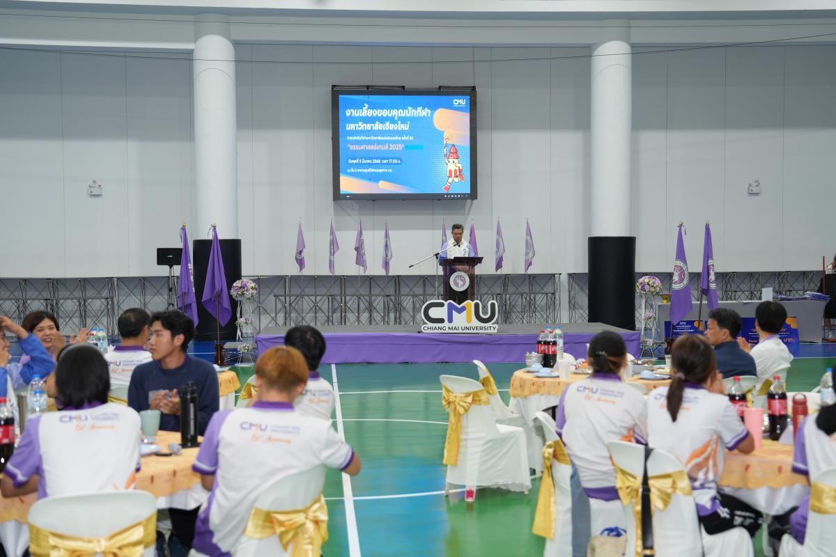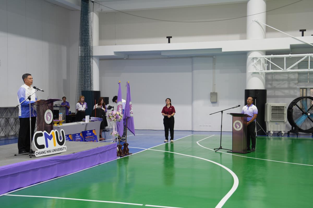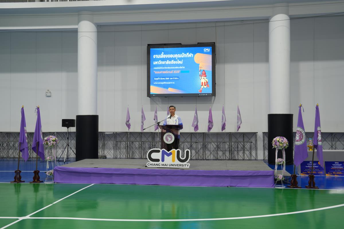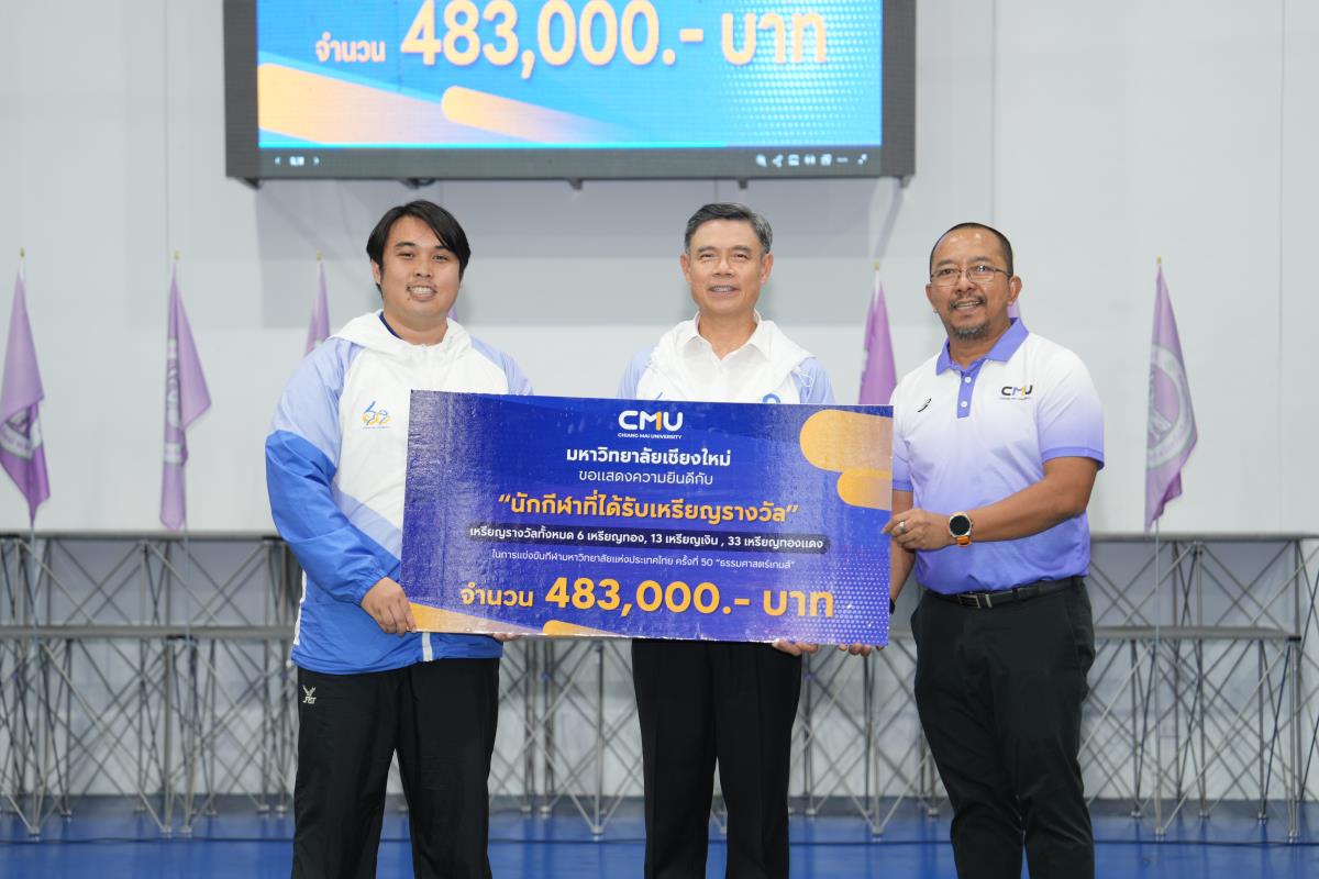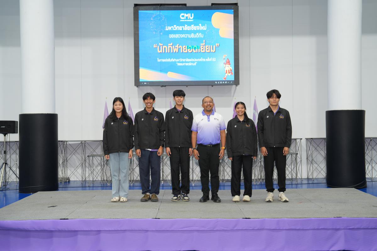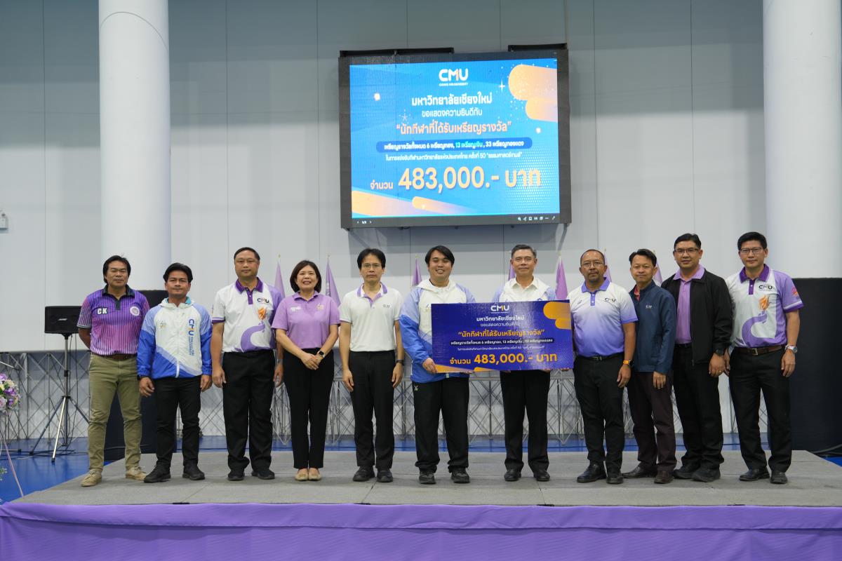 ศาสตราจารย์ ดร.นายแพทย์พงษ์รักษ์ ศรีบัณฑิตมงคล อธิการบดีมหาวิทยาลัยเชียงใหม่ พร้อมด้วยคณะผู้บริหารมหาวิทยาลัยเชียงใหม่ มอบเสื้อให้แก่นักกีฬายอดเยี่ยมฝ่ายชายและฝ่ายหญิง มอบเงินรางวัลทีมกีฬาดีเด่น มอบเงินรางวัลชมรมกีฬาดีเด่น และมอบเงินสนับสนุนนักกีฬาที่ได้รับเหรียญรางวัล ที่เข้าร่วมการแข่งขันกีฬามหาวิทยาลัยแห่งประเทศไทย ครั้งที่ 50 “ธรรมศาสตร์เกมส์” ระหว่างวันที่ 9-18 มกราคม 2568 ณ มหาวิทยาลัยธรรมศาสตร์ ศูนย์รังสิต จังหวัดปทุมธานี และกล่าวขอบคุณผู้ที่เกี่ยวข้องและให้การสนับสนุน สำหรับผลงานของทัพนักกีฬามหาวิทยาลัยเชียงใหม่ อยู่อันดับที่ 10 จากสถาบันอุดมศึกษาที่เข้าร่วมการแข่งขันกว่า 110 สถาบัน คว้าชัย 6 เหรียญทอง 13 เหรียญเงิน และ 33 เหรียญทองแดง รวม 52 เหรียญ มีนักกีฬามหาวิทยาลัยเชียงใหม่ได้รับเหรียญรางวัล จำนวน 88 คน และได้รับทุนสนับสนุนการศึกษาสำหรับนักกีฬาที่ทำชื่อเสียงให้มหาวิทยาลัยเชียงใหม่ในการแข่งขันกีฬามหาวิทยาลัยแห่งประเทศไทย ครั้งที่ 50 ดังกล่าว จำนวนมูลค่ารวมทั้งสิ้น 483,000.-บาท (สี่แสนแปดหมื่นสามพันบาทถ้วน) ณ อาคารศูนย์กีฬาและสุขภาพ ชั้น 3 มหาวิทยาลัยเชียงใหม่ เมื่อวันพุธที่ 5 มีนาคม พ.ศ.2568