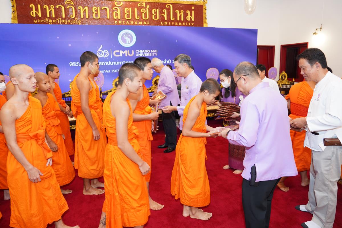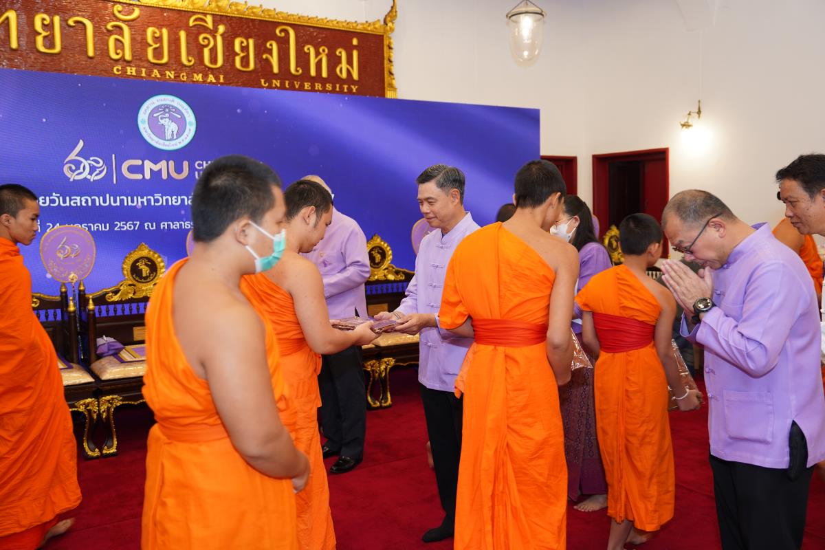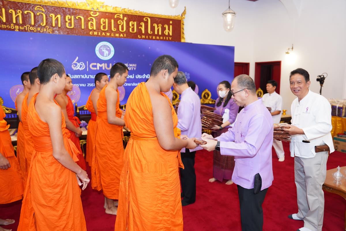 มหาวิทยาลัยเชียงใหม่ จัดพิธีทำบุญตักบาตร พระสงฆ์ 60 รูป เนื่องในโอกาสวันคล้ายวันสถาปนาการมหาวิทยาลัยเชียงใหม่ 24 มกราคม 2567 โดยมี ศาสตราจารย์เกียรติคุณ ดร.พงษ์ศักดิ์ อังกสิทธิ์ อดีตอธิการบดีมหาวิทยาลัยเชียงใหม่ เป็นประธานในพิธี พร้อมด้วยศาสตราจารย์ ดร.นพ.พงษ์รักษ์ ศรีบัณฑิตมงคล อธิการบดีมหาวิทยาลัยเชียงใหม่ คณะผู้บริหาร คณาจารย์ เจ้าหน้าที่ และนักศึกษา ร่วมพิธีฯ ณ ศาลาธรรม มหาวิทยาลัยเชียงใหม่ เมื่อวันพุธที่ 24 มกราคม พ.ศ. 2567