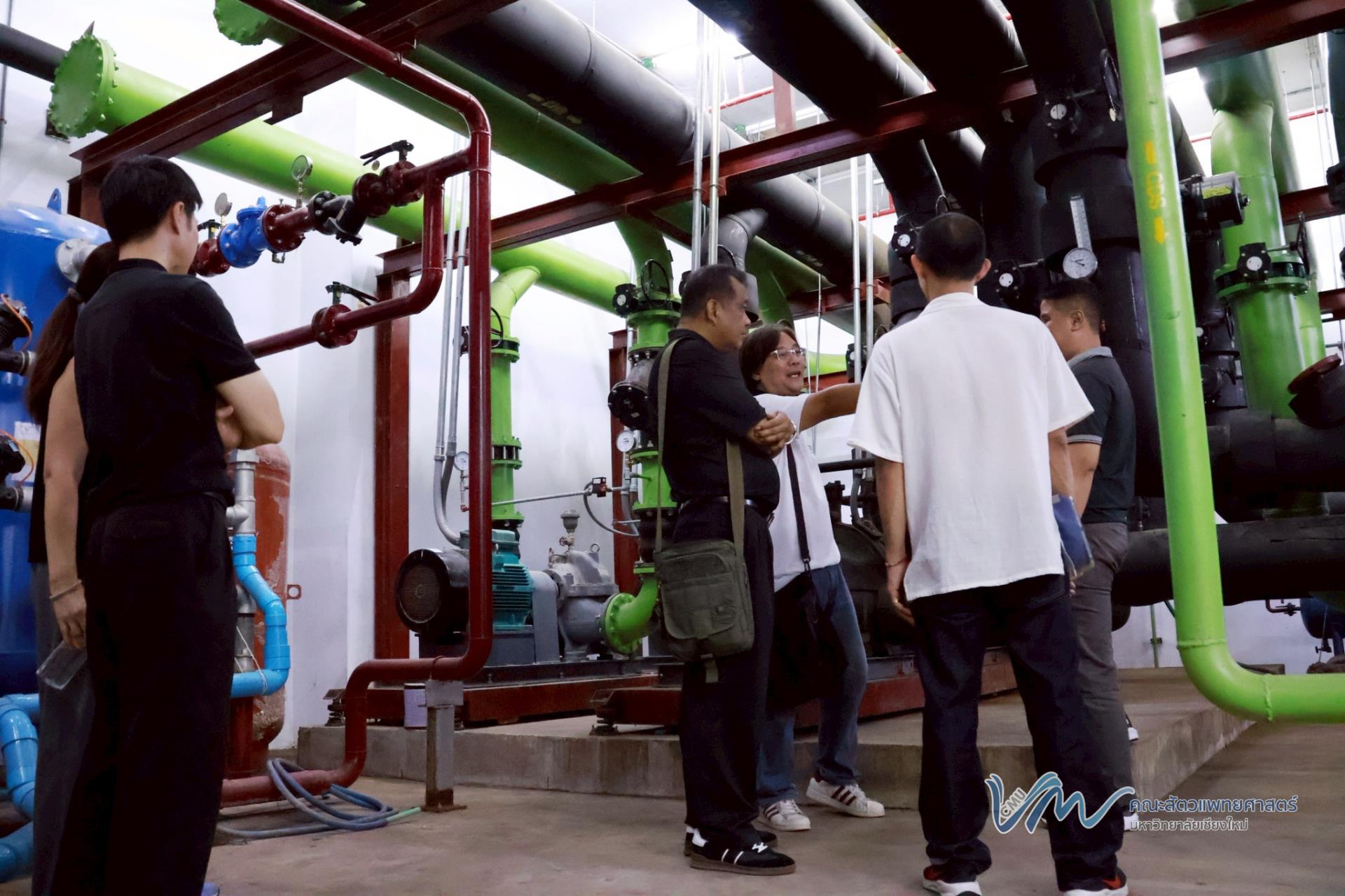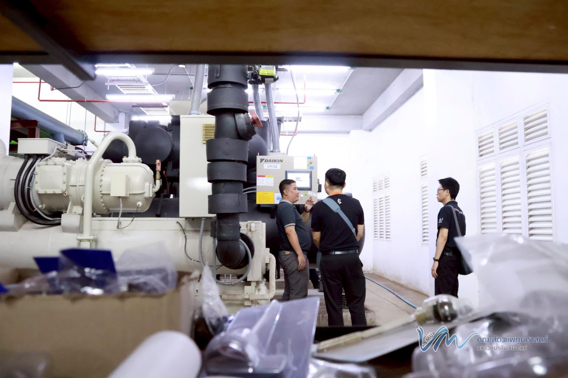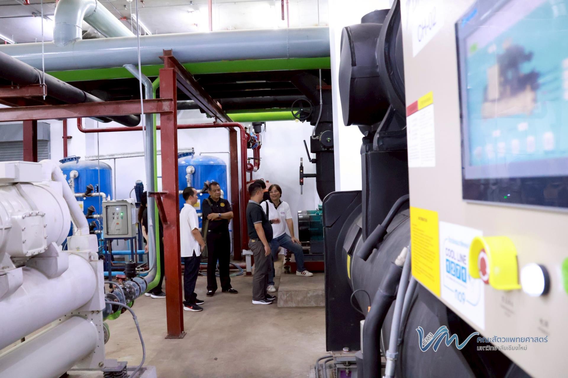 นอกจากนี้ คณะผู้ศึกษาดูงานยังได้เข้าเยี่ยมชมและศึกษาระบบปรับอากาศแบบรวมศูนย์ (Chiller) ของอาคารสัตวเวชบำรุง ซึ่งเป็นหนึ่งในระบบสำคัญด้านการบริหารจัดการพลังงานของอาคาร เพื่อเรียนรู้แนวทางการเพิ่มประสิทธิภาพการใช้พลังงานและการดำเนินงานที่เป็นมิตรต่อสิ่งแวดล้อมอย่างยั่งยืน