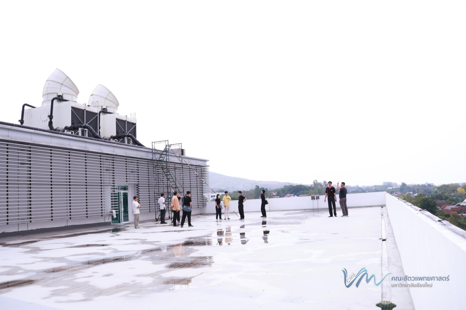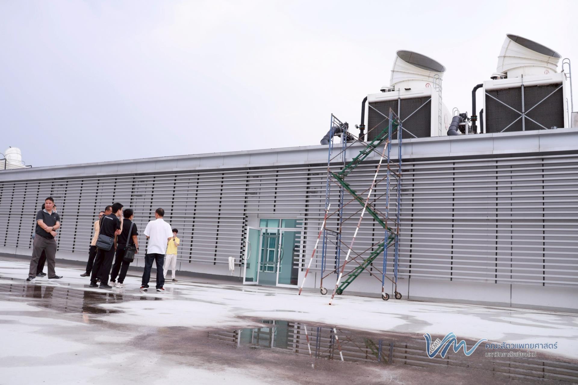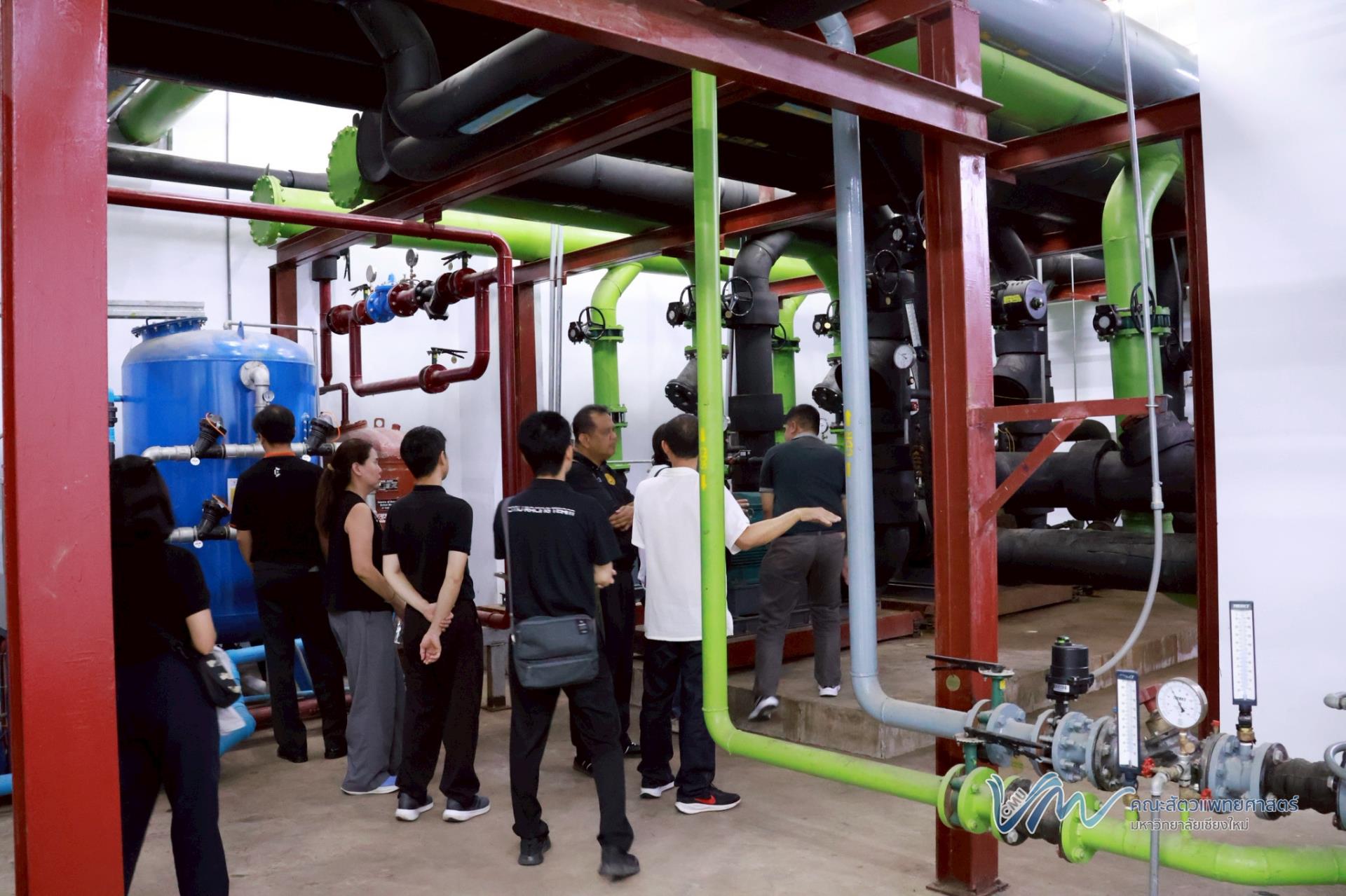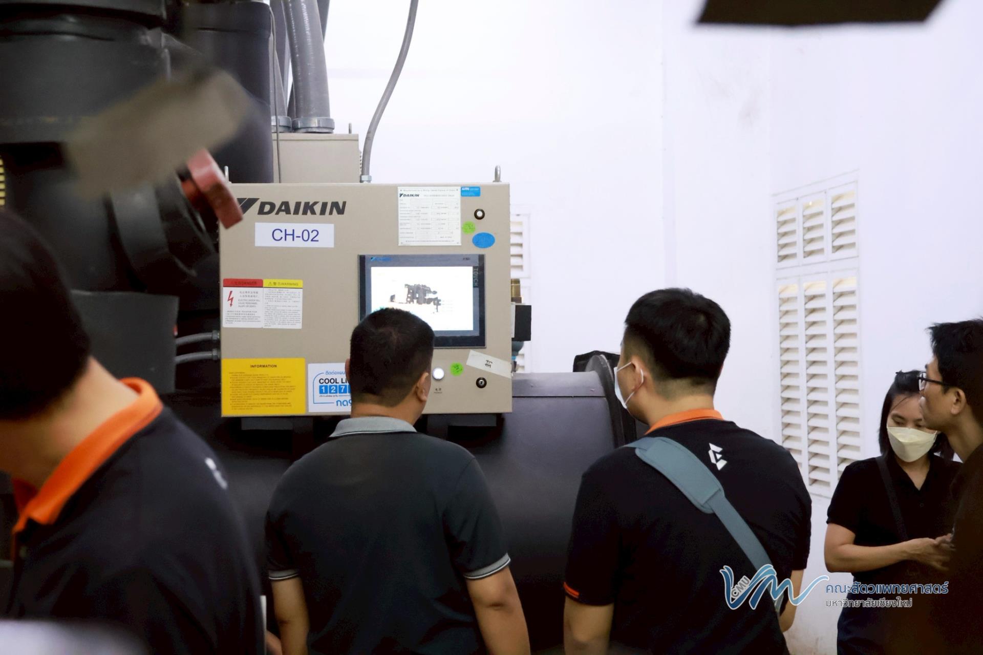 นอกจากนี้ คณะผู้ศึกษาดูงานยังได้เข้าเยี่ยมชมและศึกษาระบบปรับอากาศแบบรวมศูนย์ (Chiller) ของอาคารสัตวเวชบำรุง ซึ่งเป็นหนึ่งในระบบสำคัญด้านการบริหารจัดการพลังงานของอาคาร เพื่อเรียนรู้แนวทางการเพิ่มประสิทธิภาพการใช้พลังงานและการดำเนินงานที่เป็นมิตรต่อสิ่งแวดล้อมอย่างยั่งยืน