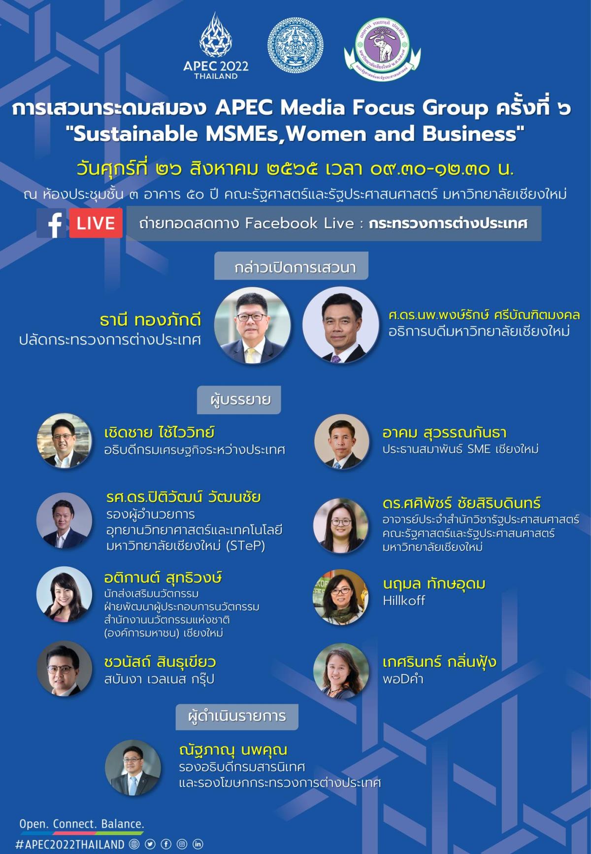 เชิญร่วมเสวนาระดมสมอง APEC Media Focus Group ครั้งที่ 6 "Sustainable MSMEs,Women and Business"