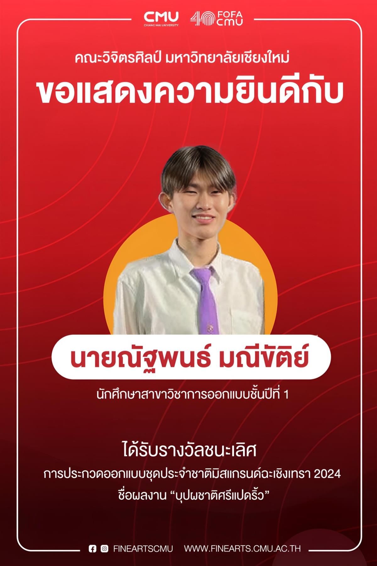 นายณัฐพนธ์ มณีขัติย์ นักศึกษาสาขาวิชาการออกแบบชั้นปีที่ 1 คณะวิจิตรศิลป์ มหาวิทยาลัยเชียงใหม่ ได้รับรางวัลชนะเลิศ การประกวดออกแบบชุดประจำชาติมิสแกรนด์ฉะเชิงเทรา 2024 ชื่อผลงาน “ บุปผชาติศรีแปดริ้ว”