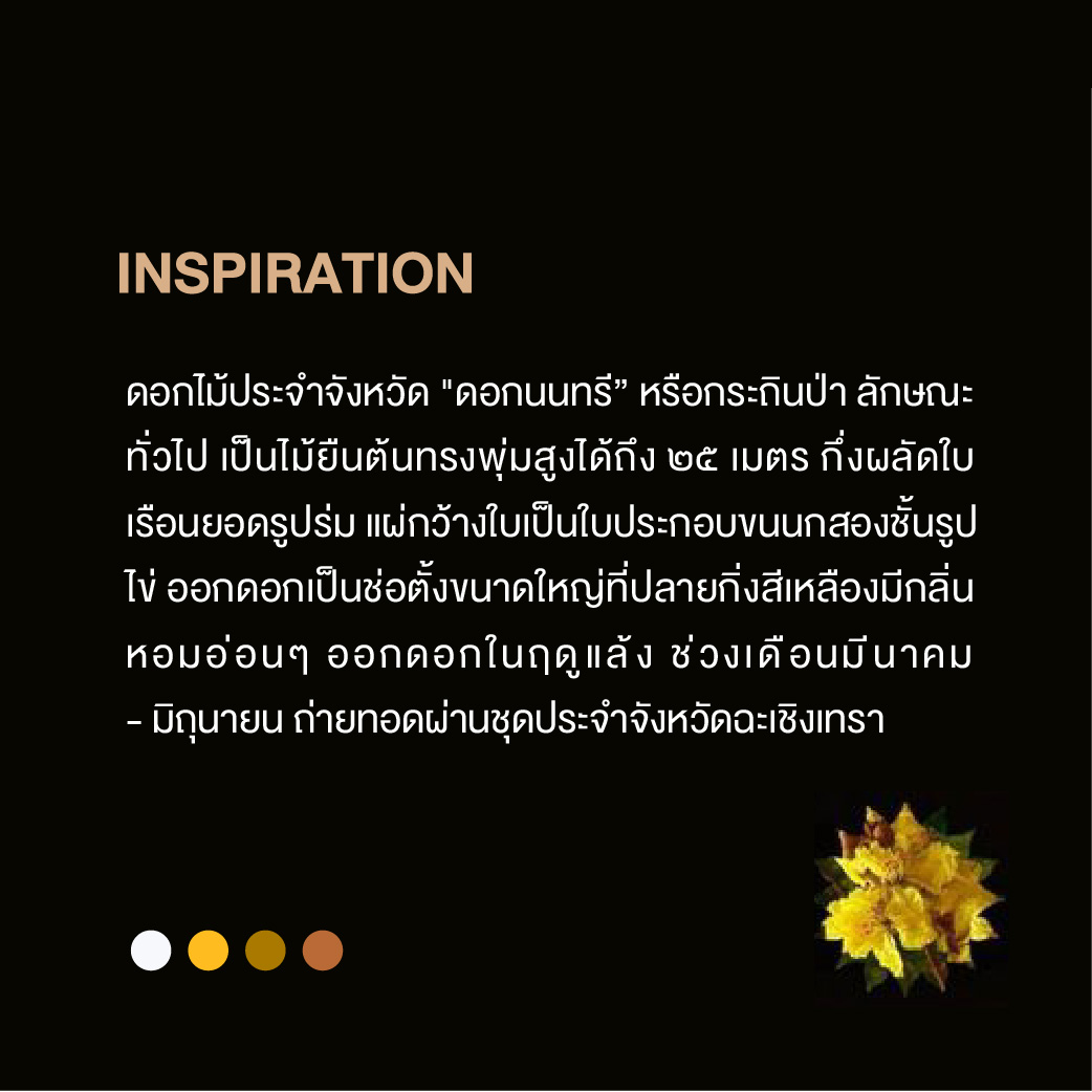 ดอกไม้ประจำจังหวัดฉะเชิงเทรา "ดอกนนทรี” หรือกระถินป่า ลักษณะทั่วไป เป็นไม้ยืนต้นทรงพุ่มสูงได้ถึง ๒๕ เมตร กึ่งผลัดใบ เรือนยอดรูปร่ม แผ่กว้างใบเป็นใบประกอบขนนกสองชั้นรูปไข่ ออกดอกเป็นช่อตั้งขนาดใหญ่ที่ปลายกิ่งสีเหลืองมีกลิ่นหอมอ่อนๆ ออกดอกในฤดูแล้ง ช่วงเดือนมีนาคม-มิถุนายนถ่ายทอดผ่านชุดประจำจังหวัดฉะเชิงเทรา