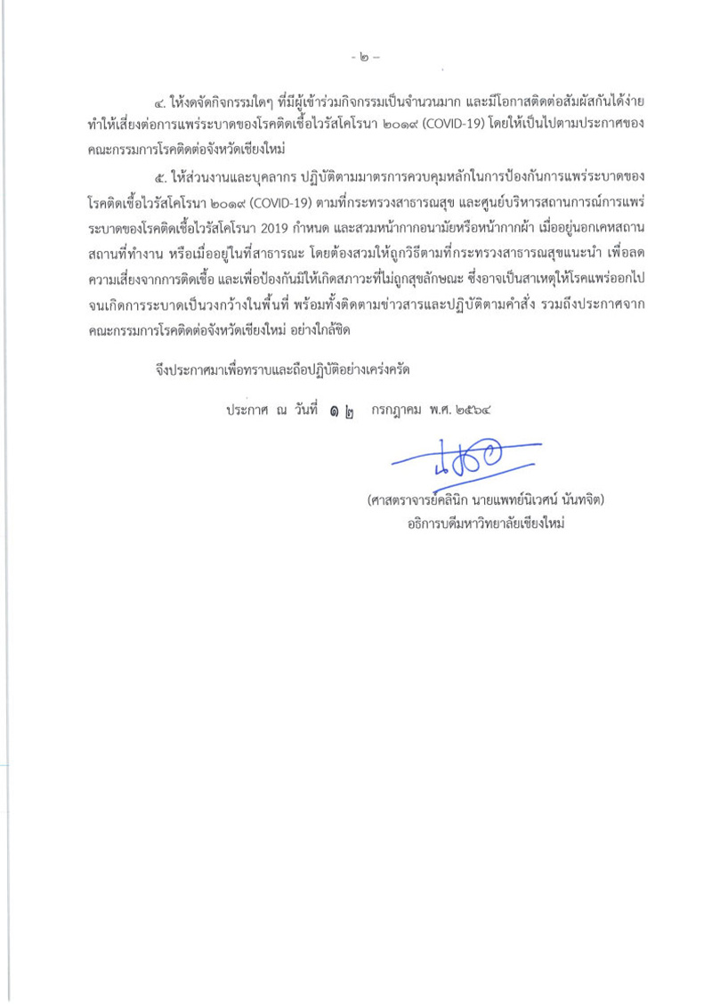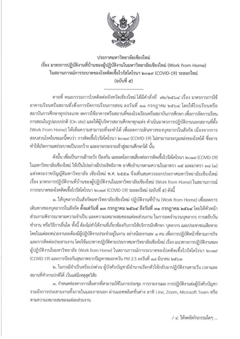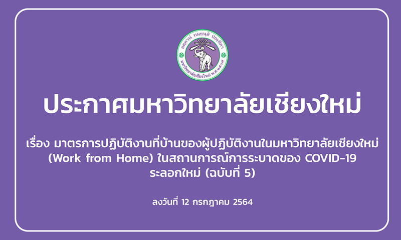 ประกาศ มาตรการปฏิบัติงานที่บ้านของผู้ปฏิบัติงานในมหาวิทยาลัยเชียงใหม่ (Work from Home) ในสถานการณ์การระบาดของโรคติดเชื้อไวรัสโคโรนา 2019 (COVID-19) ระลอกใหม่ (ฉบับที่ 5)