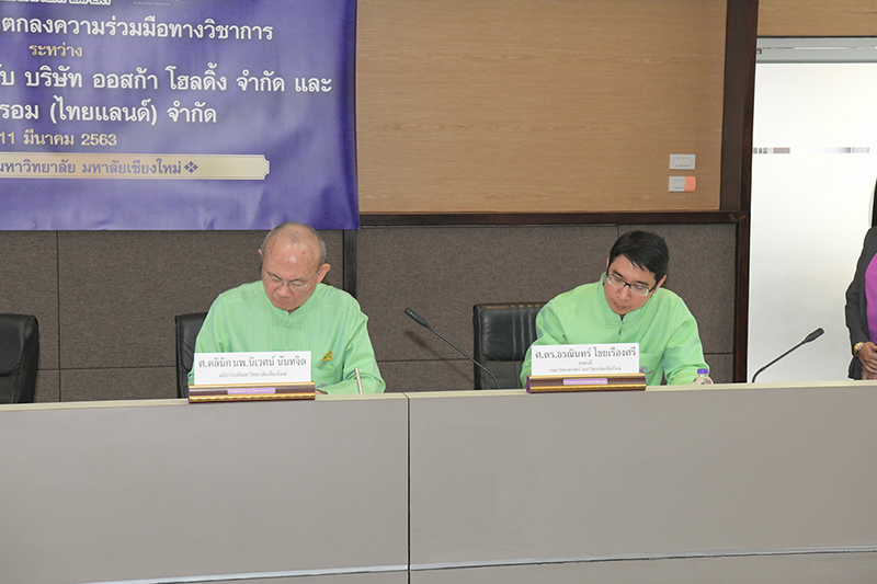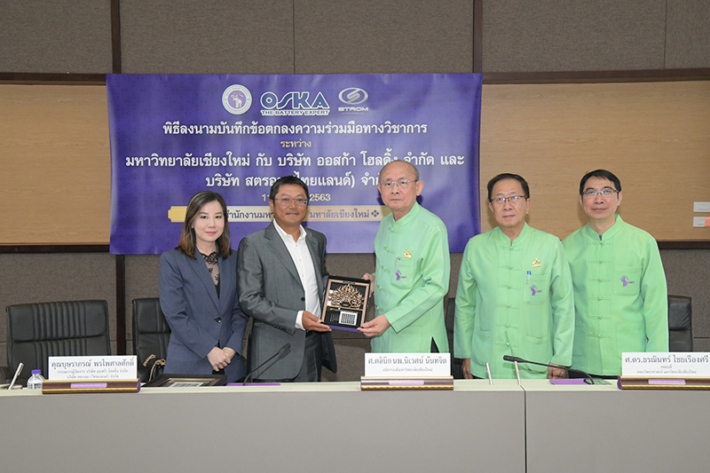 ศาสตราจารย์คลินิก นพ.นิเวศน์ นันทจิต อธิการบดีมหาวิทยาลัยเชียงใหม่ พร้อมด้วยคณะผู้บริหารมหาวิทยาลัยเชียงใหม่ ให้การต้อนรับคุณบุษราภรณ์ พรไพศาลศักดิ์ กรรมการผู้จัดการ บริษัท ออสก้า โฮลดิ้ง จำกัด และ บริษัทสตรอม (ไทยแลนด์) จำกัด พร้อมคณะในโอกาสที่มาเยี่ยมเยือนมหาวิทยาลัยเชียงใหม่ และร่วมลงนามในบันทึกข้อตกลงความร่วมมือทางวิชาการ ระหว่างมหาวิทยาลัยเชียงใหม่ ร่วมกับบริษัท ออสก้า โฮลดิ้ง จำกัด และ บริษัทสตรอม (ไทยแลนด์) จำกัด ภายใต้ความร่วมมือทางวิชาการของคณะวิทยาศาสตร์ เมื่อวันพุธที่ 11 มีนาคม 2563 ณ ห้องประชุมชั้น 5 อาคารสำนักงานมหาวิทยาลัย 2 สำนักงานมหาวิทยาลัย มหาวิทยาลัยเชียงใหม่