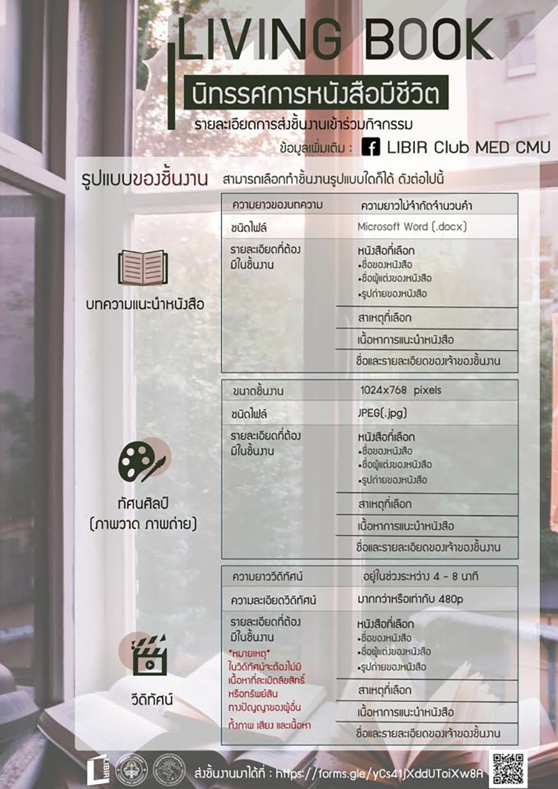 ที่ส่งมาจะถูกรวบรวมมาจัดนิทรรศการ “Living Book หนังสือมีชีวิต” ในวันที่ 18-22 พ.ย. 62 นี้ ณ โถงทางเดิน ชั้น 1 อาคารเรียนรวม คณะแพทยศาสตร์ มหาวิทยาลัยเชียงใหม่