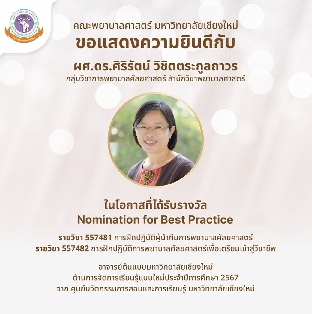 คณะพยาบาลศาสตร์ มหาวิทยาลัยเชียงใหม่ ขอแสดงความยินดีแก่ ผู้ช่วยศาสตราจารย์ ดร.ศิริรัตน์ วิชิตตระกูลถาวร ท่านเป็นผู้ที่มีความรู้ ความสามารถ และประสบการณ์สูงในการขับเคลื่อนการจัดการเรียนรู้ที่สอดคล้องกับ Future Skill Sets ผ่านกรอบสมรรถนะการจัดการเรียนรู้นำไปสู่การปรับเปลี่ยนรูปแบบการเรียนการสอนให้สอดคล้องกับทักษะในศตวรรษที่ 21 ได้มีประสิทธิภาพอย่างแท้จริง
