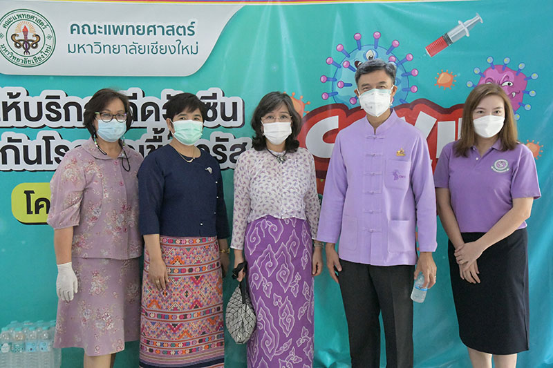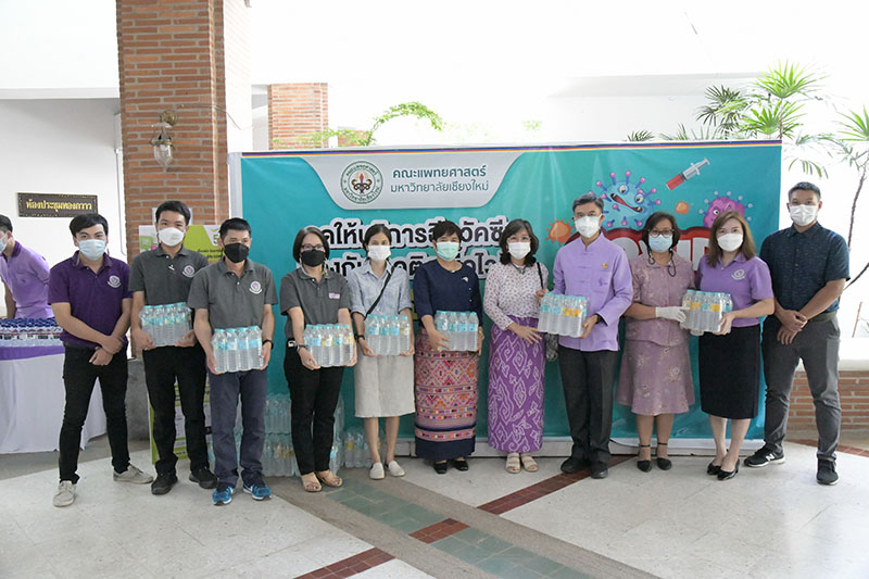ศาสตราจารย์ ดร.นายแพทย์พงษ์รักษ์ ศรีบัณฑิตมงคล รองอธิการบดีมหาวิทยาลัยเชียงใหม่ รับมอบน้ำดื่ม จำนวน 80 แพ็ค จาก ผู้ช่วยศาสตราจารย์วิลาวัณย์ เศวตเศรนี ผู้อำนวยการสำนักส่งเสริมศิลปวัฒนธรรม มหาวิทยาลัยเชียงใหม่ และเจ้าหน้าที่สำนักฯ เพื่อส่งมอบให้กับบุคลากรทางการแพทย์ของโรงพยาบาลมหาราชนครเชียงใหม่ จิตอาสาการให้บริการภาคประชาชนในการเข้ารับวัคซีนของมหาวิทยาลัยเชียงใหม่และประชาชนที่เข้ารับการฉีดวัคซีนป้องกัน COVID-19 ณ หอประชุมมหาวิทยาลัยเชียงใหม่ เมื่อวันอังคารที่ 29 มิถุนายน 2564