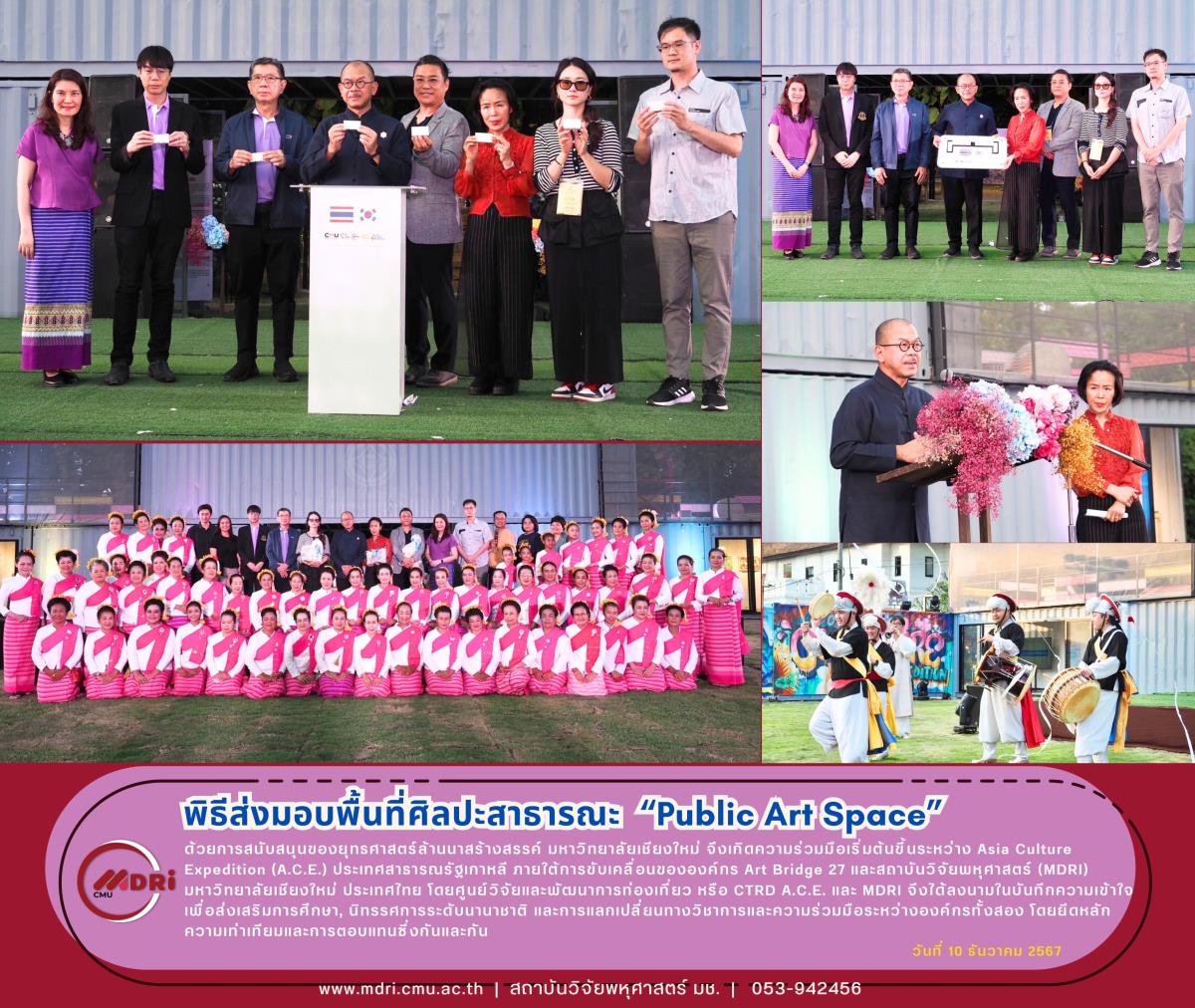 วันอังคารที่ 10 ธันวาคม 2567 เวลา 17.15 – 18.00 น. ศาสตราจารย์ปฏิบัติ ดร. เอกชัย มหาเอก รองอธิการบดีมหาวิทยาลัยเชียงใหม่ และรักษาการแทนผู้อำนวยการสำนักส่งเสริมศิลปวัฒนธรรมและ ล้านนาสร้างสรรค์ ให้เกียรติเป็นประธาน กล่าวต้อนรับและแสดงความขอบคุณ ในพิธีส่งมอบพื้นที่ศิลปะสาธารณะ “Public Art Space ”พร้อมด้วยศาสตราจารย์เกียรติคุณ ดร.สัญชัย จตุรสิทธา ผู้อำนวยการสถาบันวิจัยพหุศาสตร์ ผู้ช่วยศาสตราจารย์ ดร.รชนิภาส สุแก้ว สมัครธำรงไทย รองผู้อำนวยการถาบันวิจัยพหุศาสตร์ ดร.กรวรรณ สังขกร หัวหน้าศูนย์วิจัยและพัฒนาการท่องเที่ยว สถาบันวิจัยพหุศาสตร์ ร่วมกันเปิดพื้นที่แห่งนี้อย่างเป็นทางการ ณ Creative Lanna Festival, Main Stage
