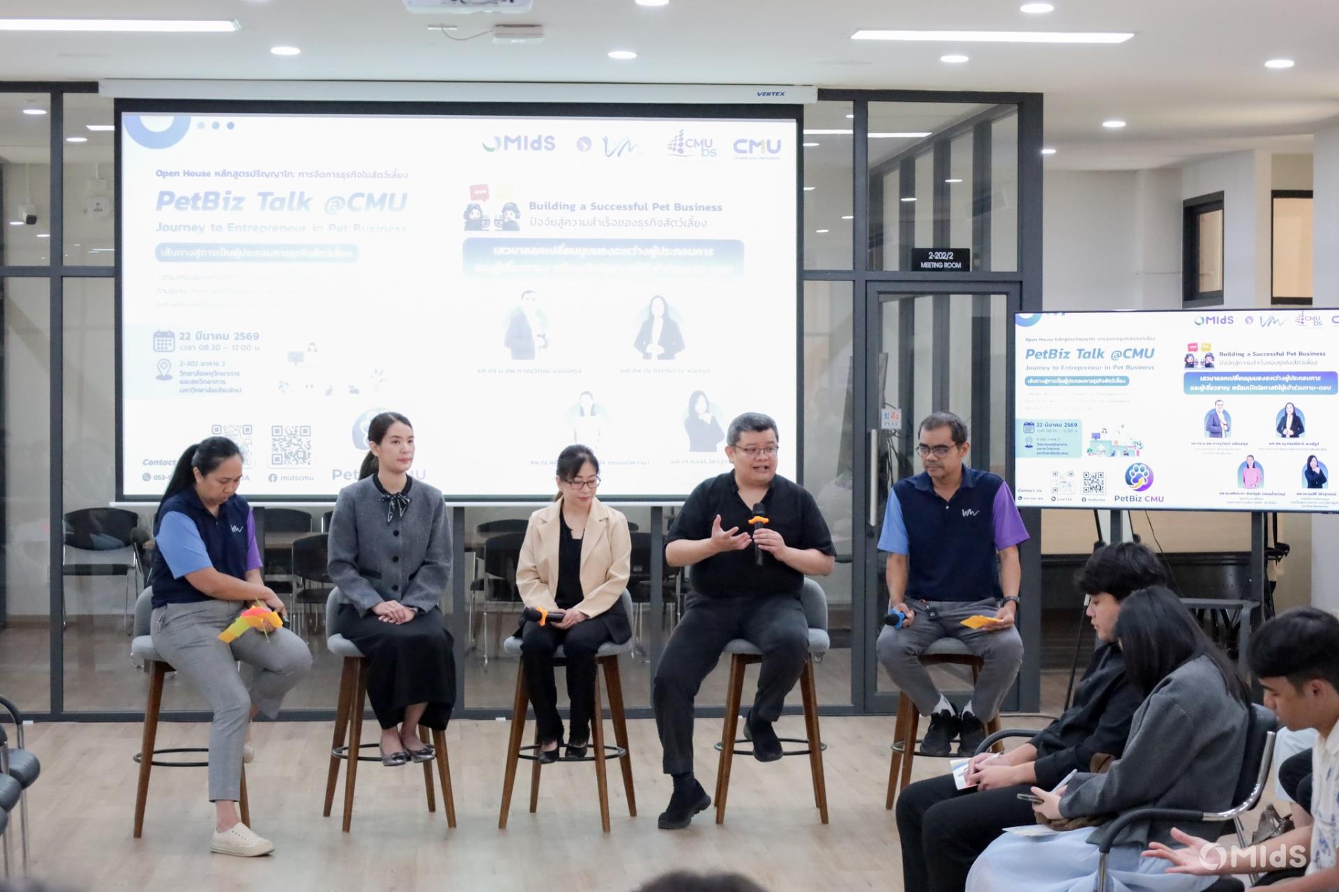 วันอาทิตย์ที่ 22 มีนาคม 2569 วิทยาลัยพหุวิทยาการและสหวิทยาการ ร่วมกับคณะสัตวแพทยศาสตร์และคณะบริหารธุรกิจ มช. จัดกิจกรรมเปิดบ้าน PetBiz CMU หลักสูตรใหม่ปริญญาโท หลักสูตรในสาขาวิชาบูรณาการศาสตร์ ของ MIdS CMU Journey to Entrepreneur in Pet Business "เส้นทางสู่การเป็นผู้ประกอบการธุรกิจสัตว์เลี้ยง" เวทีแลกเปลี่ยนประสบการณ์จากผู้ประกอบการและผู้เชี่ยวชาญด้านธุรกิจที่จะพาไปรู้จักโอกาส ความท้าทาย และบทเรียนสำคัญในการสร้างธุรกิจในอุตสาหกรรมสัตว์เลี้ยง ณ ห้อง 2-202 อาคาร 2 MIdS CMU โดยมี อ. ดร. สพ.ญ.ธนาพร เอี่ยมสำอางค์ อาจารย์คณะสัตวแพทยศาสตร์ มช. เป็นผู้ดำเนินรายการ