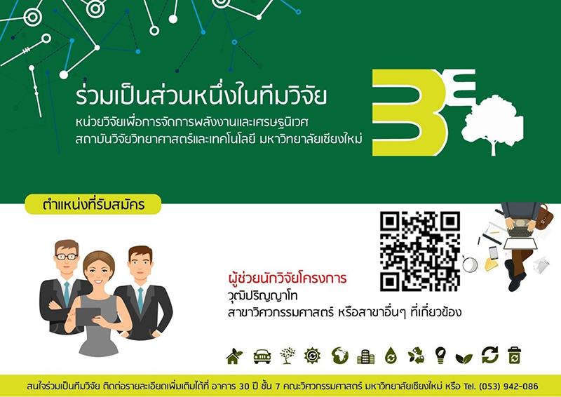 หน่วยวิจัยเพื่อการจัดการพลังงานและเศรษฐนิเวศ สถาบันวิจัยวิทยาศาสตร์และเทคโนโลยี มหาวิทยาลัยเชียงใหม่ ประกาศรับสมัครงานตำแหน่ง นักวิจัยโครงการ จำนวน 2 อัตรา ดังรายละเอียดและใบสมัครแนบได้ที่