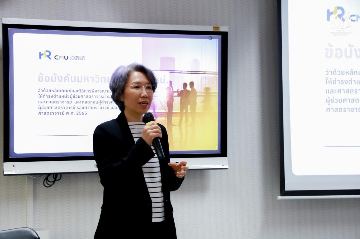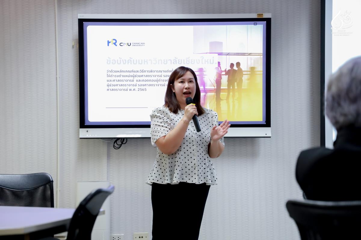 การอบรมครั้งนี้มีวัตถุประสงค์เพื่อเสริมสร้างความเข้าใจให้แก่คณาจารย์เกี่ยวกับข้อบังคับ มาตรฐาน และเอกสารที่เกี่ยวข้อง ตลอดจนแนวทางการจัดทำผลงานเฉพาะด้านให้สอดคล้องกับกรอบเวลาและคุณภาพตามเกณฑ์ที่กำหนด โดยได้รับเกียรติจาก คุณอัจฉรีย์ สมวงค์ และ คุณนฤมล สุขเสาร์ นักทรัพยากรบุคคลจากกองทรัพยากรทุนมนุษย์ สำนักงานมหาวิทยาลัย มหาวิทยาลัยเชียงใหม่ ทำหน้าที่เป็นวิทยากร ถ่ายทอดความรู้และประสบการณ์อย่างเข้มข้นและเป็นประโยชน์ต่อการพัฒนาทางวิชาการของคณาจารย์