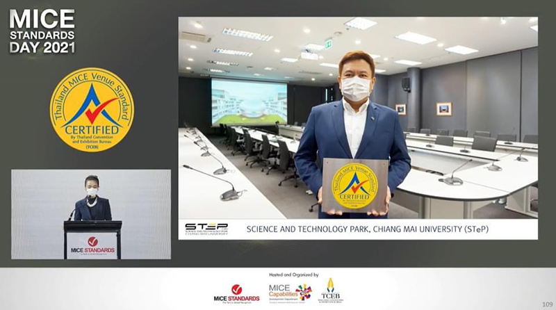 วันที่ 26 สิงหาคม 2564 มหาวิทยาลัยเชียงใหม่ โดย STeP ในฐานะผู้รับผิดชอบการบริหารจัดการอาคารอำนวยการอุทยานวิทยศาสตร์ภาคเหนือ (NSP) (ที่สนับสนุนโดยกระทรวง อว.) เข้าร่วมงาน MICE Standard Day 2021 ผ่านระบบออนไลน์ เพื่อรับมอบตรามาตรฐานสถานที่จัดงานประเทศไทย (Thailand MICE Venue Standard: TMVS) ประเภท Meeting Rooms จากสำนักงานส่งเสริมการจัดการประชุมและนิทรรศการ (องค์การมหาชน) เพื่อเป็นการรับรองมาตรฐานพื้นที่ให้บริการห้องประชุม ประเภทองค์กรภาครัฐ/เอกชน