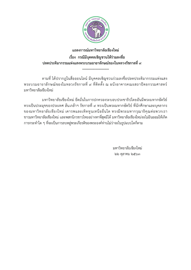 แถลงการณ์มหาวิทยาลัยเชียงใหม่ เรื่อง กรณีมีบุคคลเชิญชวนให้ร่วมลงชื่อ ปลดประติมากรรมแห่งแสงพระบรมฉายาลักษณ์ของในหลวงรัชกาลที่ ๙