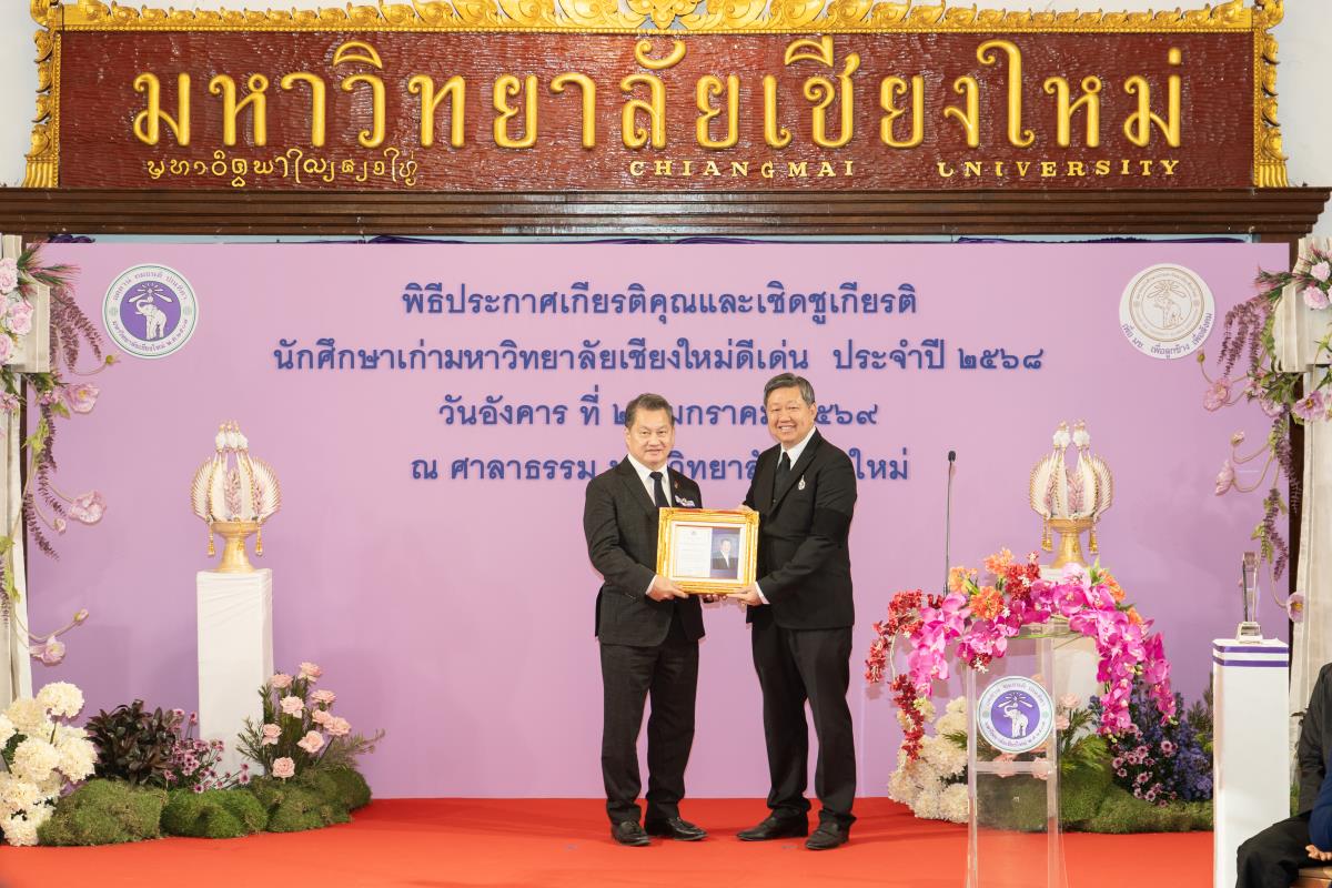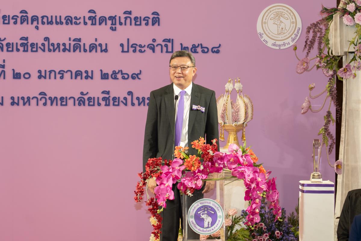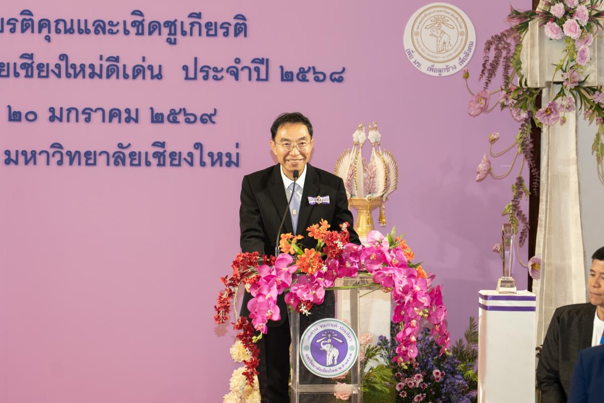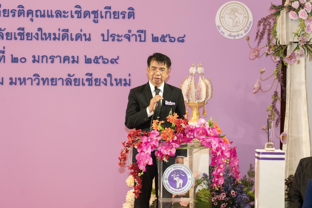 ศาสตราจารย์ ดร.นายแพทย์พงษ์รักษ์ ศรีบัณทิตมงคล อธิการบดีมหาวิทยาลัยเชียงใหม่ เป็นประธานในพิธีประกาศเกียรติคุณและแสดงความยินดีแก่นักศึกษาเก่ามหาวิทยาลัยเชียงใหม่ดีเด่น ประจำปี 2568 ทั้งภาครัฐและเอกชนร่วมกัน 7 สาขา ประกอบด้วย 1.สาขาวิชาการ 2.สาขาบริหารองค์กรการศึกษา 3.สาขาบริหารราชการ หรือ สาขาบริหารรัฐกิจ 4.สาขาบริหารธุรกิจ หรือ สาขาบริหารองค์กร 5.สาขาบริการสังคม 6.สาขาส่งเสริมศิลปวัฒนธรรม และสิ่งแวดล้อม 7. สาขาอื่นๆ เพื่อยกย่องและเชิดชูเกียรติให้แก่นักศึกษาเก่ามหาวิทยาลัยเชียงใหม่ที่ประสบความสำเร็จในหน้าที่การงาน มุ่งมั่นสร้างสรรค์พัฒนาตนเอง ครอบครัว หน่วยงาน องค์กร สนับสนุนและช่วยเหลือมหาวิทยาลัยในด้านต่างๆ เมื่อวันอังคารที่ 20 มกราคม 2569 ณ ศาลาธรรม มหาวิทยาลัยเชียงใหม่