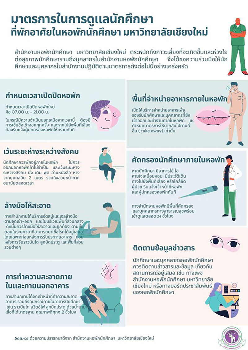 มหาวิทยาลัยเชียงใหม่ยังคงเปิดให้นักศึกษาสามารถพักอาศัยในหอพักนักศึกษาได้ในสถานการณ์การแพร่ระบาดของโรคติดเชื้อไวรัสโคโรนา 2019 (COVID-19) แต่เพิ่มมาตรการควบคุมเพื่อลดโอกาสการติดเชื้อ เช่น ให้มีทางเข้า–ออกทางเดียว โดยมีการคัดกรองโรคด้วยเครื่องวัดอุณหภูมิร่างกายก่อนเข้าอาคาร มีบริการเจลแอลกอฮอล์ล้างมือตามจุดเข้า–ออกหอพักนักศึกษา รวมถึงในบริเวณพื้นที่ส่วนกลาง มีการทำความสะอาดอาคาร อุปกรณ์ภายในตัวอาคารหอพักนักศึกษา เช่น ลูกบิดประตู ราวบันได สวิตช์ไฟ และปุ่มกดลิฟต์ ด้วยน้ำยาฆ่าเชื้อโรคทุก 2 ชั่วโมง เป็นต้น นักศึกษาต้องรักษาระยะห่างทางสังคม นั่ง เดิน พูดคุย รับประทานอาหาร ใช้ห้องอ่านหนังสือ ใช้ห้องกิจกรรมต่างๆ ในหอพักห่างจากบุคคลอื่นอย่างน้อย 2 เมตร เพื่อความปลอดภัย ดูเเลสุขภาพอนามัยส่วนบุคคล ล้างมือด้วยสบู่ทุกครั้ง เมื่อจับสิ่งของส่วนรวม ก่อนหลังรับประทานอาหาร ก่อนหลังเข้าห้องน้ำ สวมหน้ากากอนามัยเเละถอดทิ้งอย่างถูกวิธี เมื่อมีความจำเป็นในการเดินทางออกจากหอพัก ควรบันทึกสถานที่เเละเส้นทางเพื่อความสะดวกในการตรวจสอบของเจ้าหน้าที่ เเละปฏิบัติตามประกาศของกระทรวงสาธารณสุขอย่างเคร่งครัด เเละที่สำคัญที่สุด หากมีอาการ ไข้ ปวดศีรษะ ไอ หายใจเหนื่อยหอบ รีบเเจ้งเจ้าหน้าที่ในหอพักเพื่อคัดกรองเเละส่งตรวจรักษา ยิ่งรู้เร็ว ยิ่งคัดกรอง เเละรักษาได้เร็ว