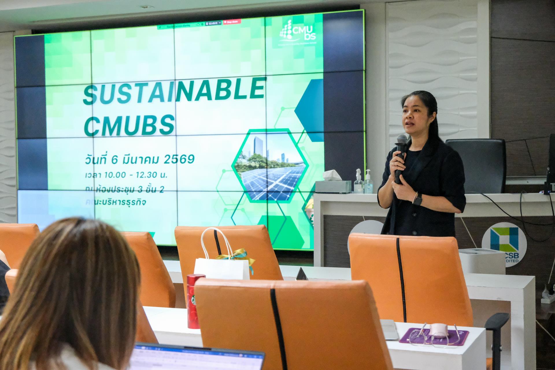 วันที่ 6 มีนาคม 2569 คณะบริหารธุรกิจ มหาวิทยาลัยเชียงใหม่ จัดประชุมบุคลากรภายใต้โครงการ Sustainable CMUBS ณ ห้องประชุม 3 คณะบริหารธุรกิจ มหาวิทยาลัยเชียงใหม่ เพื่อถ่ายทอดนโยบายและแนวทางการพัฒนาคณะสู่ความยั่งยืน สอดรับกับทิศทางของมหาวิทยาลัยเชียงใหม่ที่มุ่งสู่การเป็นมหาวิทยาลัยชั้นนำที่รับผิดชอบต่อสังคมเพื่อการพัฒนาที่ยั่งยืนด้วยนวัตกรรม โดยนำเป้าหมายการพัฒนาที่ยั่งยืนขององค์การสหประชาชาติ (Sustainable Development Goals: SDGs) มาเป็นกรอบแนวทางในการขับเคลื่อนการพัฒนาในมิติเศรษฐกิจ สังคม และสิ่งแวดล้อม รวมถึงบูรณาการเข้ากับวิสัยทัศน์ พันธกิจ และยุทธศาสตร์ของมหาวิทยาลัยอย่างเป็นระบบ