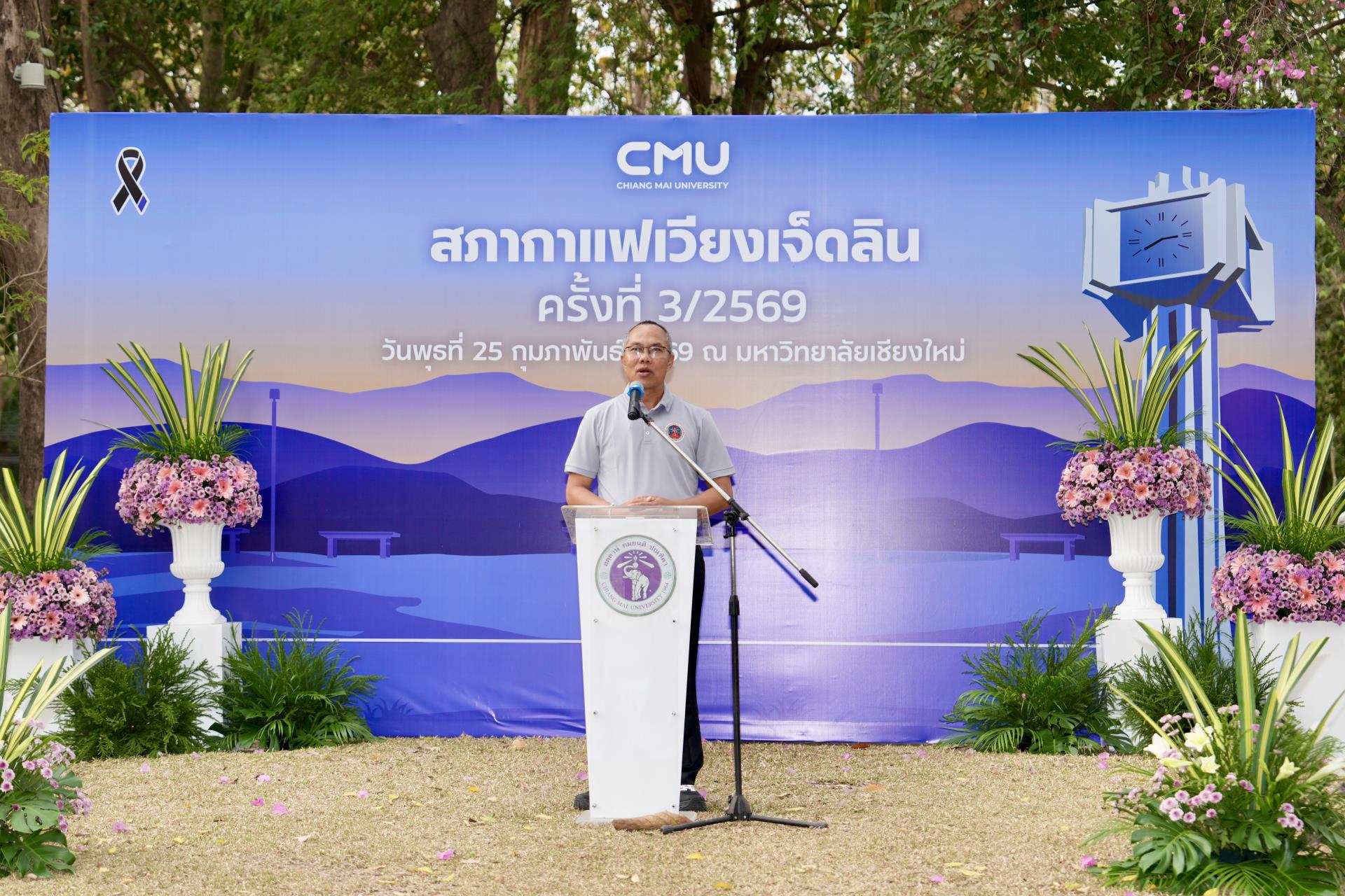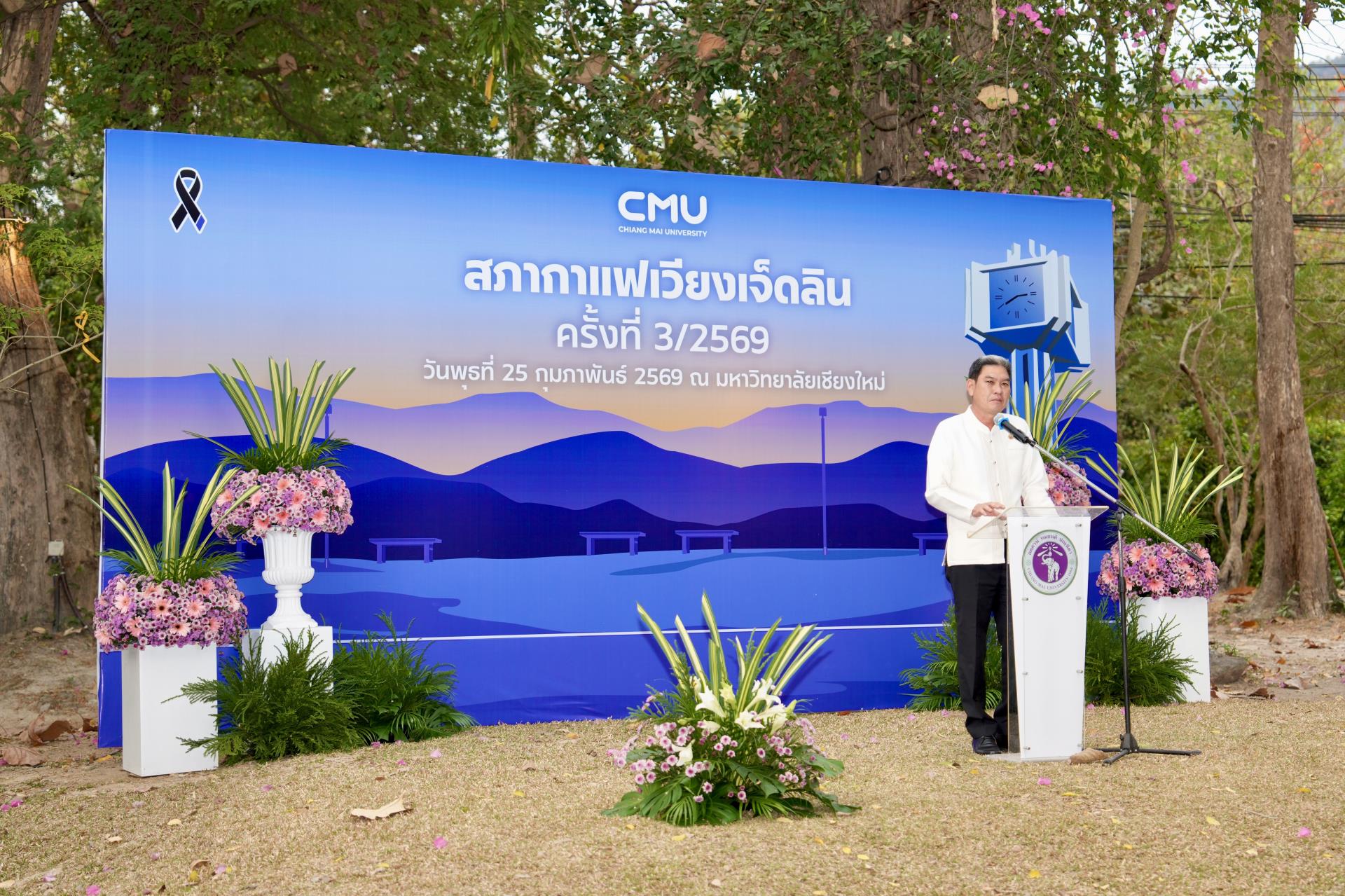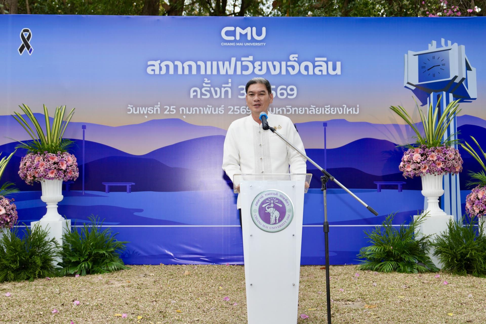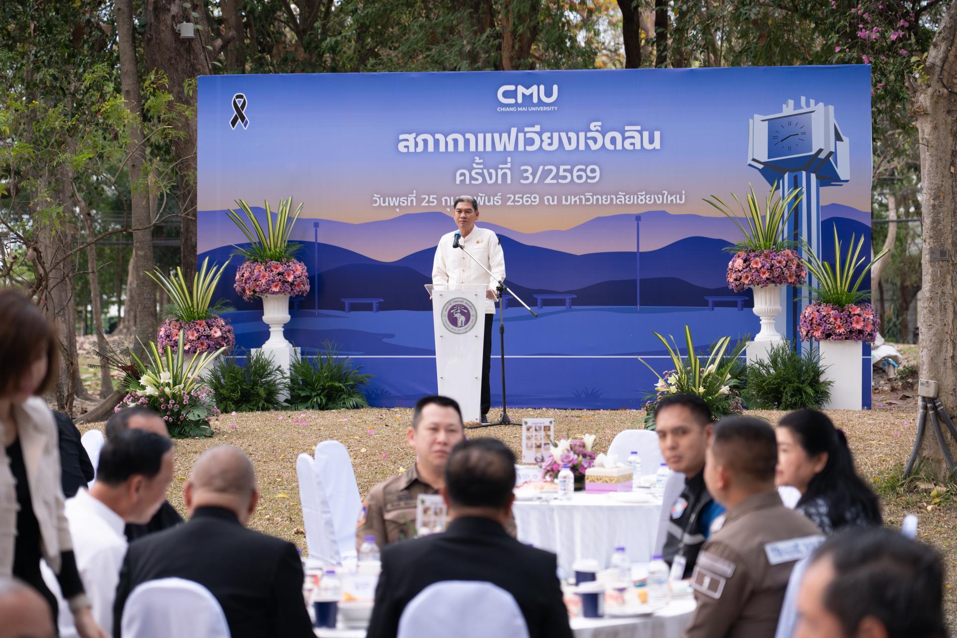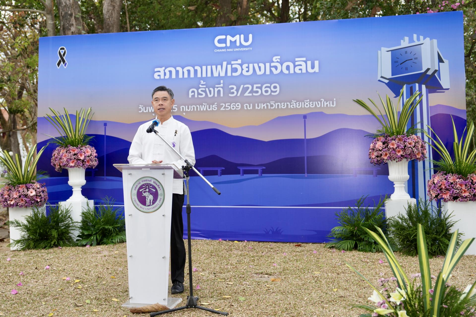 ศาสตราจารย์ ดร.นายแพทย์พงษ์รักษ์ ศรีบัณฑิตมงคล อธิการบดีมหาวิทยาลัยเชียงใหม่ กล่าวต้อนรับ นายรัฐพล นราดิศร ผู้ว่าราชการจังหวัดเชียงใหม่ พร้อมด้วยคณะผู้บริหาร ผู้แทน เจ้าหน้าที่ จากหน่วยงาน องค์กรต่างๆ ในเขตพื้นที่เวียงเจ็ดลิน ที่มาร่วมกิจกรรมสภากาแฟเวียงเจ็ดลิน ครั้งที่ 3/2569 ซึ่งมหาวิทยาลัยเชียงใหม่ เป็นเจ้าภาพจัดงาน เพื่อแลกเปลี่ยนข้อคิดเห็น ข้อมูลข่าวสาร กิจกรรมต่างๆ ของแต่ละหน่วยงาน และส่งมอบป้ายเจ้าภาพจัดกิจกรรมครั้งต่อไปให้แก่ส่วนจัดการต้นน้ำและพัฒนาชุมชนในพื้นที่ป่าอนุรักษ์ อุทยานดอยสุเทพ – ปุย สถานีควบคุมไฟป่าภูพิงค์ สวนรุกขชาติห้วยแก้ว และศูนย์วนวัฒนวิจัยที่ 1 (เชียงใหม่) ณ ลานสัก ศาลาธรรม มหาวิทยาลัยเชียงใหม่ เมื่อวันพุธที่ 25 กุมภาพันธ์ พ.ศ. 2569