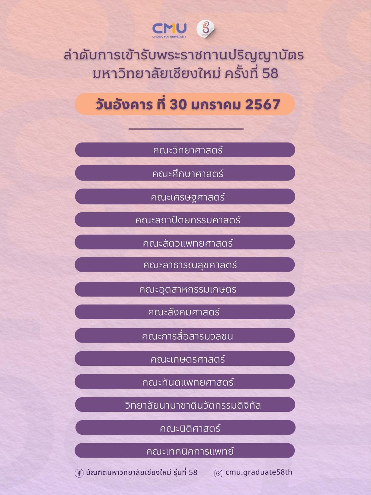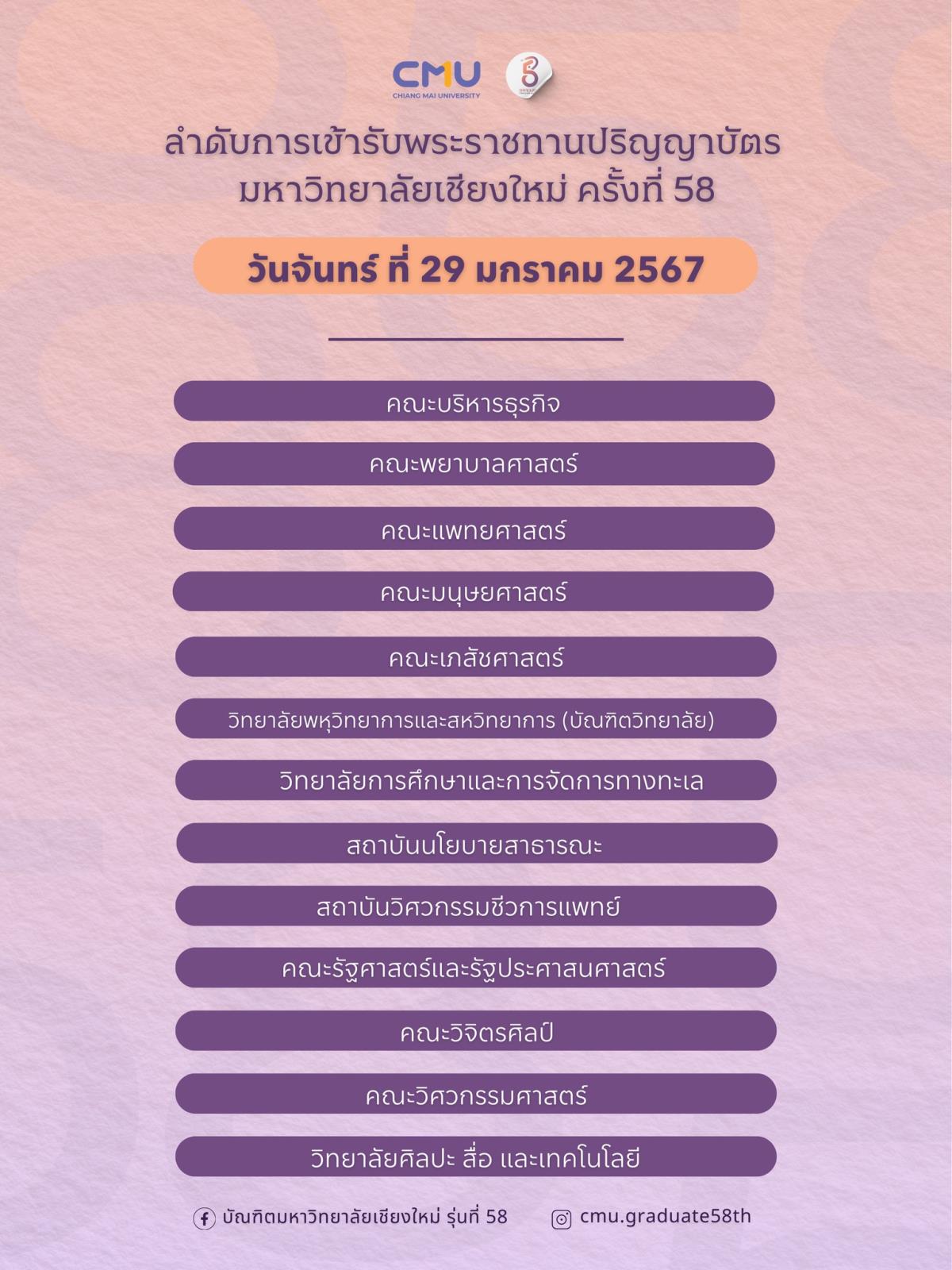 ลำดับการเข้ารับพระราชทานปริญญาบัตร มหาวิทยาลัยเชียงใหม่ ครั้งที่ 58 วันจันทร์ที่ 29 และ วันอังคารที่ 30 มกราคม 2567
