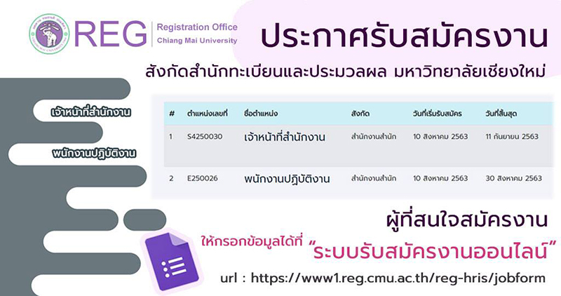 สำนักทะเบียนและประมวลผล มหาวิทยาลัยเชียงใหม่ รับสมัครบุคคลเพื่อคัดเลือกเข้าเป็นพนักงานมหาวิทยาลัย รวมจำนวน 2 อัตรา ดังนี้