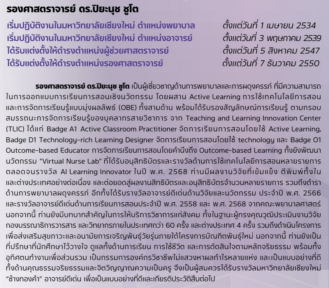 ศาสตราจารย์พิเศษ ดร.สุรเกียรติ์ เสถียรไทย นายกสภามหาวิทยาลัยเชียงใหม่ เป็นประธานมอบรางวัลมหาวิทยาลัยเชียงใหม่ "ช้างทองคำ" อาจารย์ดีเด่น สาขาวิชาวิทยาศาสตร์สุขภาพ ประจำปี 2568 แด่ รองศาสตราจารย์ ดร.ปิยะนุช ชูโต กลุ่มวิชาการพยาบาลสูติศาสตร์และนรีเวชวิทยา คณะพยาบาลศาสตร์ มหาวิทยาลัยเชียงใหม่ ในพิธีทำบุญวันคล้ายวันสถาปนามหาวิทยาลัยเชียงใหม่ ประจำปี 2569 ในโอกาสนี้ ผู้ช่วยศาสตราจารย์ ดร.สุภารัตน์ วังศรีคูณ คณบดี พร้อมด้วยคณะผู้บริหาร คณาจารย์ และบุคลากรของคณะฯ ร่วมแสดงความยินดี ณ ศาลาธรรม มหาวิทยาลัยเชียงใหม่ เมื่อวันเสาร์ที่ 24 มกราคม 2569