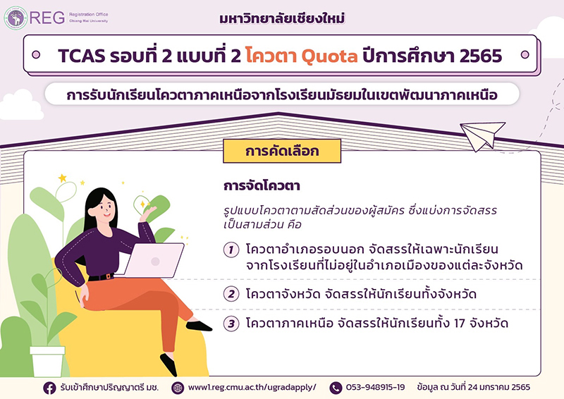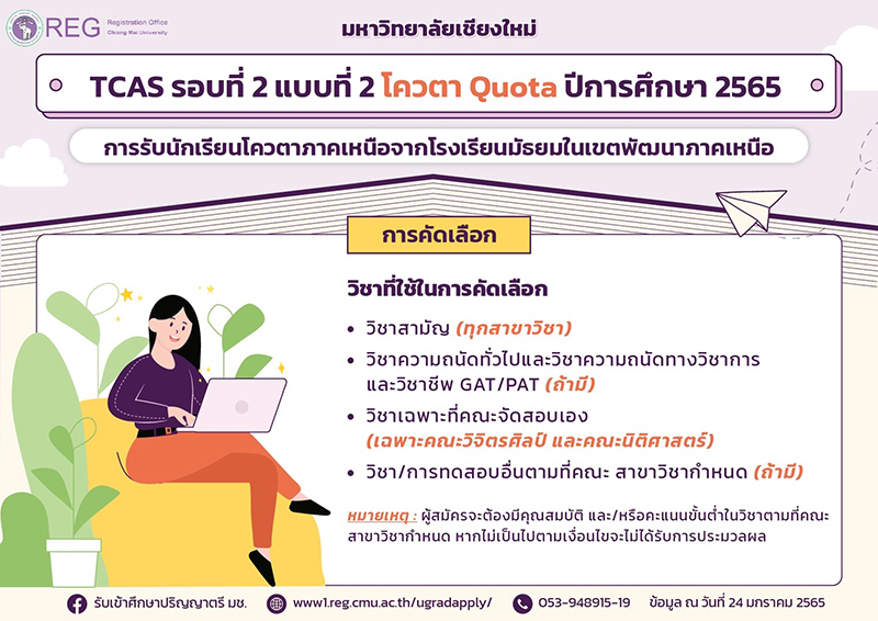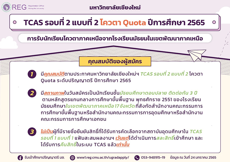 มหาวิทยาลัยเชียงใหม่ เปิดรับสมัครคัดเลือกบุคคลเข้าศึกษาใน TCAS รอบที่ 2 แบบที่ 2 โควตา Quota ระดับปริญญาตรี ปีการศึกษา 2565 เพื่อส่งเสริมและกระจายโอกาสทางการศึกษาให้นักเรียนระดับมัธยมศึกษาตอนปลาย ได้เข้าศึกษาต่อในมหาวิทยาลัยเชียงใหม่
