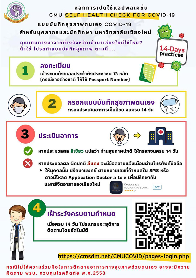 คณะสาธารณสุขศาสตร์ มหาวิทยาลัยเชียงใหม่ พัฒนาแบบบันทึกสุขภาพโควิด-19 "CMU SELF HEALTH CHECK FOR COVID-19 " แบบ 3 ภาษา สำหรับนักศึกษาและบุคลากรมหาวิทยาลัยเชียงใหม่ ที่มีประวัติเดินทางมาจากต่างจังหวัดที่เป็นพื้นที่เสี่ยงตามประกาศของกรมควบคุมโรค โดยบุคลากรและนักศึกษาดังกล่าวจะต้องทำการรายงานสุขภาพของตนเองติดต่อกันเป็นเวลา 14 วัน วันละ 1 ครั้ง ผ่านโปรแกรมเพื่อประเมินความเสี่ยงในการติดโรคโควิด19 หากมีอาการเข้าข่ายเกณฑ์ผู้ติดเชื้อโควิด 19 ระบบจะส่ง SMS แจ้งเตือนให้ทราบทันที พร้อมคำแนะนำและ link เชื่อมโยงแอปพลิเคชัน Doctor A to Z ฟรี ไม่มีค่าใช้จ่าย โดยการใช้ คูปองโค๊ด cmuxc19 ผ่านระบบ teleconsult กรณีที่ต้องการปรึกษาแพทย์อาสา และจะมีเจ้าหน้าที่จากหน่วยงานของมหาวิทยาลัยมาดูแลเพื่อประสานงานนำส่งพบแพทย์ต่อไป