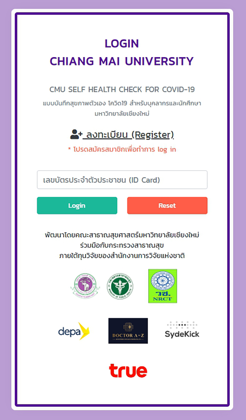 แบบบันทึกสุขภาพโควิด 19 สำหรับบุคลากรและนักศึกษา มหาวิทยาลัยเชียงใหม่นี้ พัฒนาโดยคณะสาธารณสุขศาสตร์มหาวิทยาลัยเชียงใหม่ ร่วมมือกับกระทรวงสาธารณสุข ภายใต้ทุนวิจัยของสำนักงานการวิจัยแห่งชาติ (วช.) และสนับสนุนการส่ง SMS โดยบริษัท ทรู คอร์ปอเรชั่น (True Corporation)