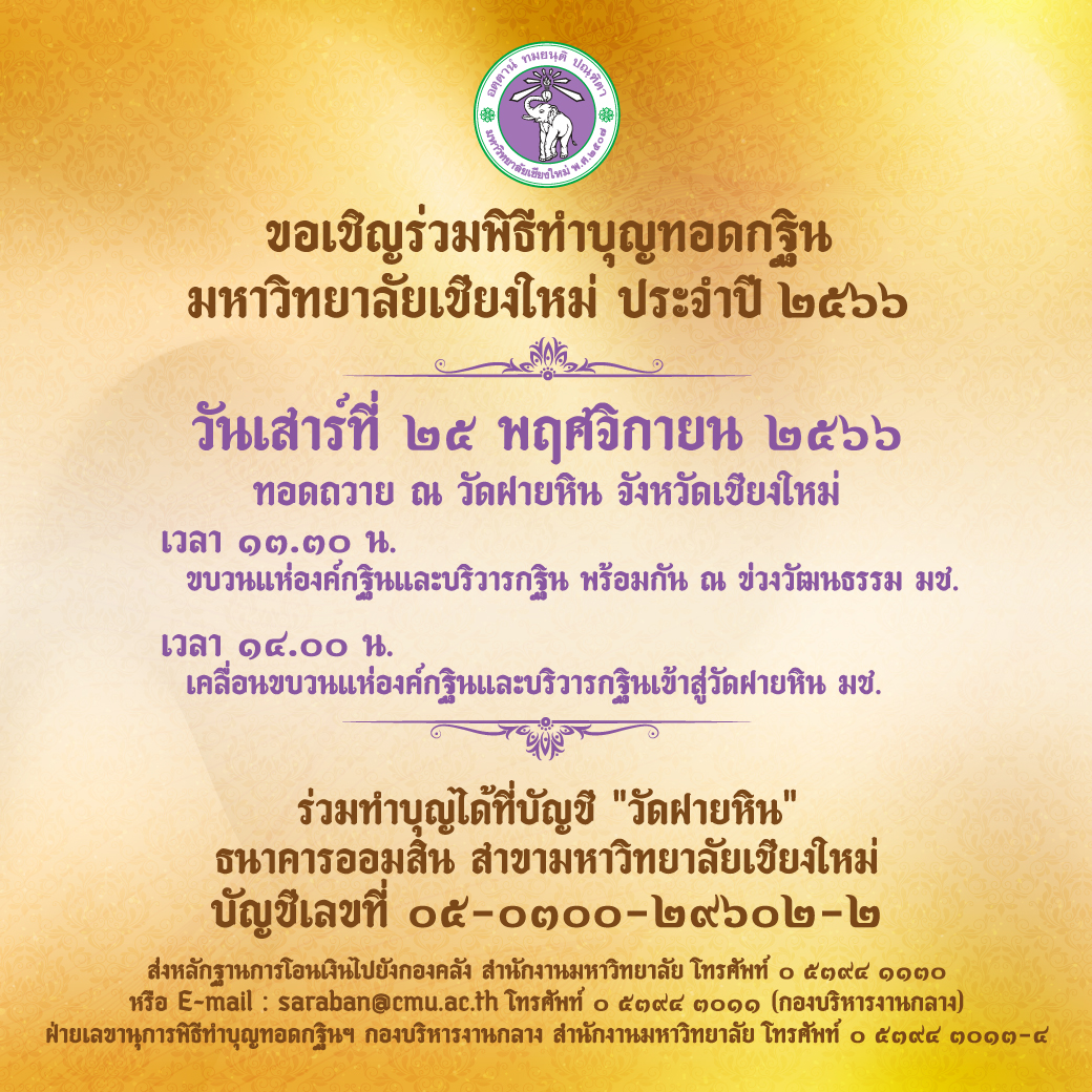 มหาวิทยาลัยเชียงใหม่ จัดพิธีทำบุญทอดกฐินมหาวิทยาลัยเชียงใหม่ ประจำปี 2566 ในวันที่ 25 พฤศจิกายน 2566 ทอดถวาย ณ วัดฝายหิน ตำบลสุเทพ อำเภอเมือง จังหวัดเชียงใหม่