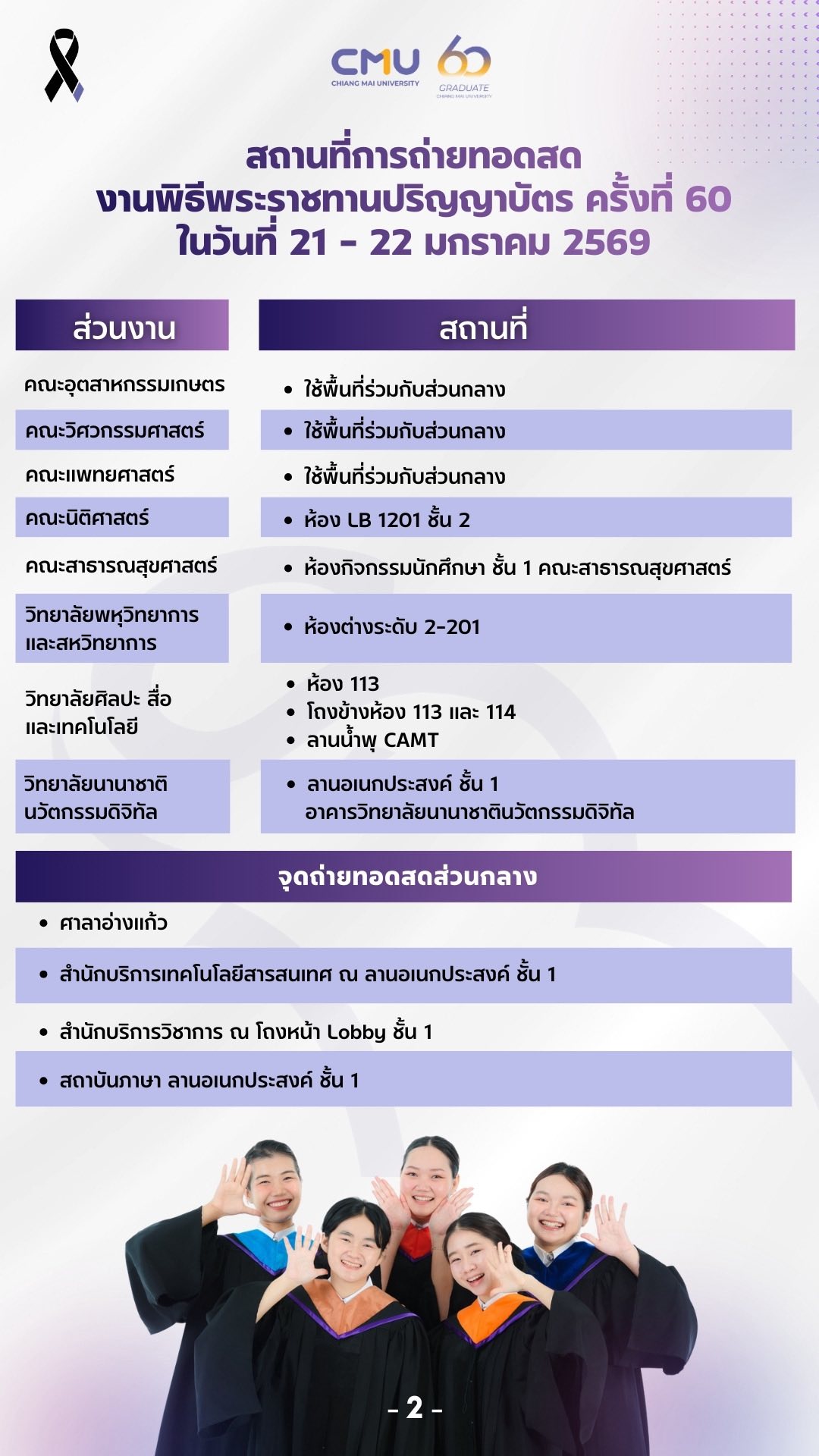 มหาวิทยาลัยเชียงใหม่ เตรียมถ่ายทอดสดพิธีพระราชทานปริญญาบัตร ครั้งที่ 60 ในวันที่ 21 - 22 มกราคม 2569 เพื่ออำนวยความสะดวกแก่ผู้ปกครองและผู้มาร่วมแสดงความยินดีกับบัณฑิต สามารถรับชมงานพิธีพระราชทานปริญญาบัตรได้ทางการถ่ายทอดสด ณ จุดต่างๆ ที่คณะและส่วนงานได้จัดพื้นที่อำนวยความสะดวก รวมถึงสถานที่ถ่ายทอดส่วนกลาง ณ สำนักบริการเทคโนโลยีสารสนเทศ (ITSC) บริเวณลานอเนกประสงค์ ชั้น1 สถาบันภาษา และศาลาอ่างแก้ว