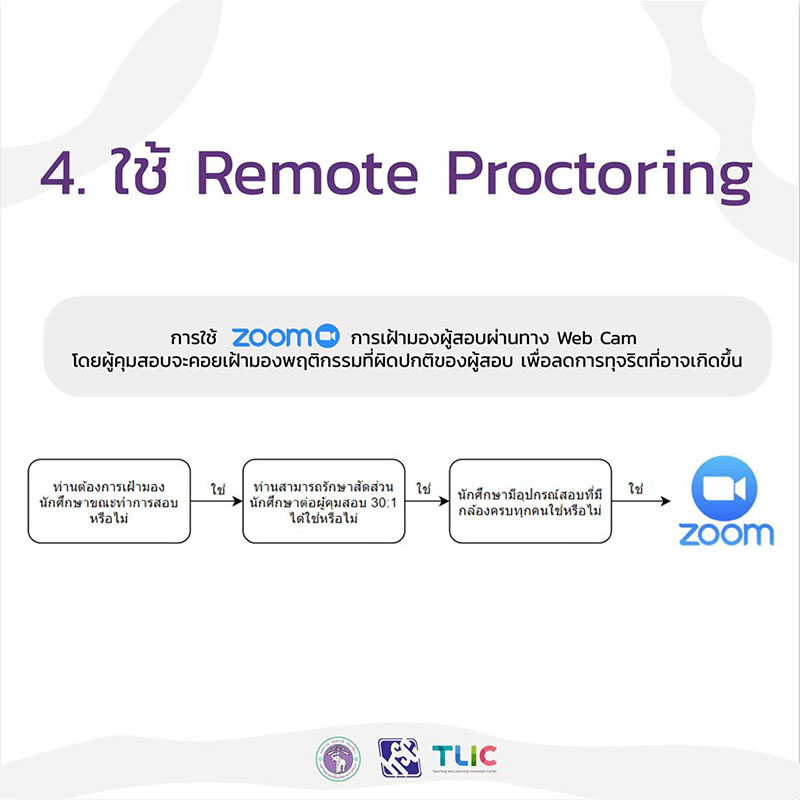 การใช้ Zoom Meeting ในการเฝ้ามองผู้สอบผ่านทาง Web Cam โดยผู้คุมสอบจะคอยเฝ้ามองพฤติกรรมที่ผิดปกติของผู้สอบ เพื่อลดการทุจริตที่อาจเกิดขึ้น
