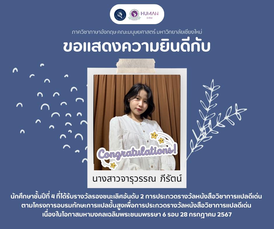 นางสาวจารุวรรณ ภีรัตน์ นักศึกษาชั้นปีที่ 4 ภาควิชาภาษาอังกฤษ คณะมนุษยศาสตร์ มหาวิทยาลัยเชียงใหม่ ได้รับรางวัลรองชนะเลิศอันดับ 2 จากการประกวดรางวัลหนังสือวิชาการแปลดีเด่น ตามโครงการอบรมทักษะการแปลขั้นสูงเพื่อการประกวดรางวัลหนังสือวิชาการแปลดีเด่น เนื่องในโอกาสมหามงคลเฉลิมพระชนมพรรษา 6 รอบ 28 กรกฎาคม 2567 โดยประกาศ ณ วันที่ 8 สิงหาคม 2568