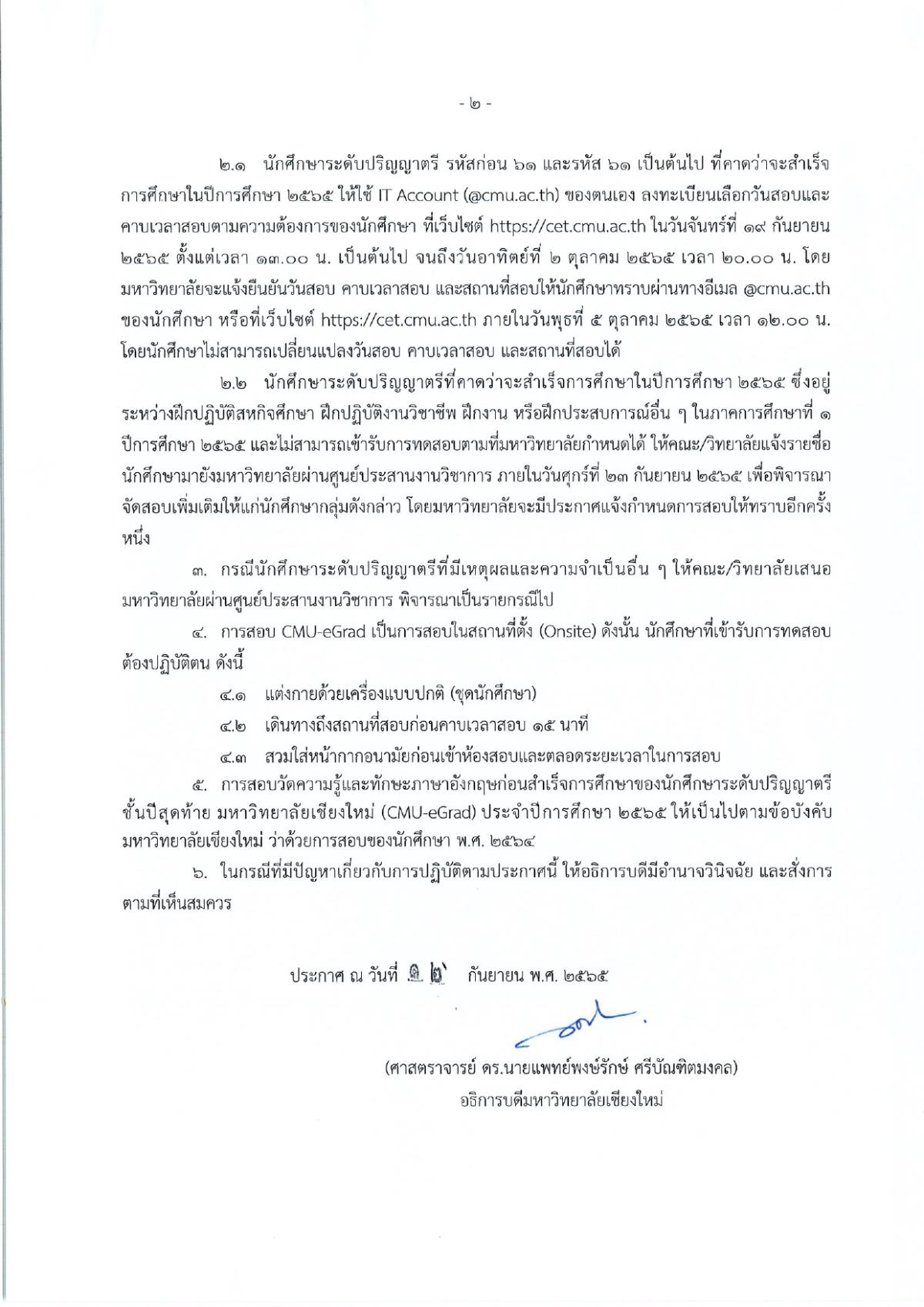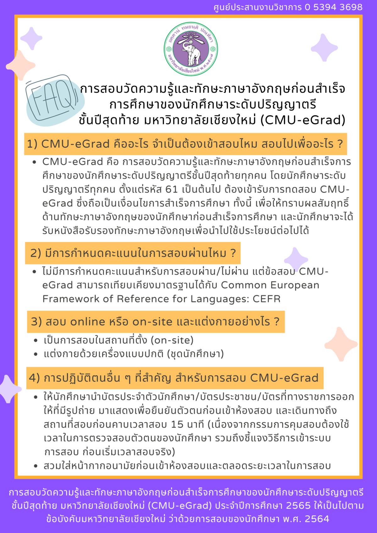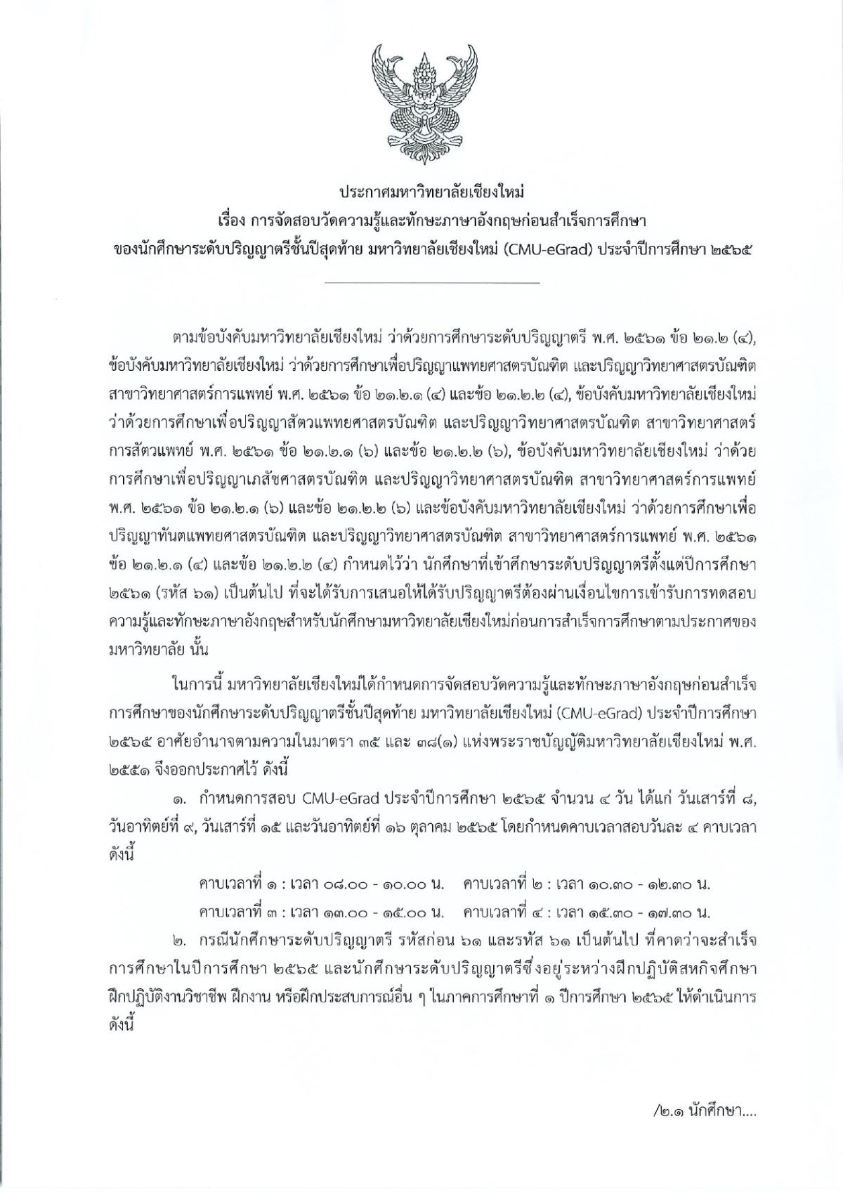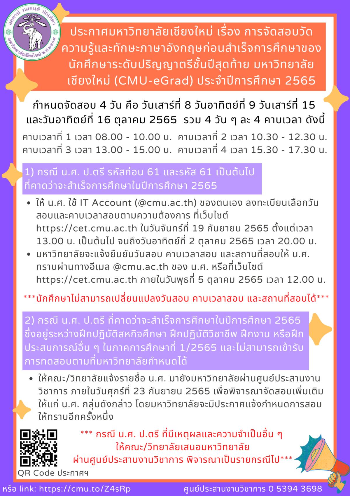 การจัดสอบวัดความรู้และทักษะภาษาอังกฤษก่อนสำเร็จการศึกษาของนักศึกษาระดับปริญญาตรีชั้นปีสุดท้าย มหาวิทยาลัยเชียงใหม่ (CMU-eGrad) ประจำปีการศึกษา 2565