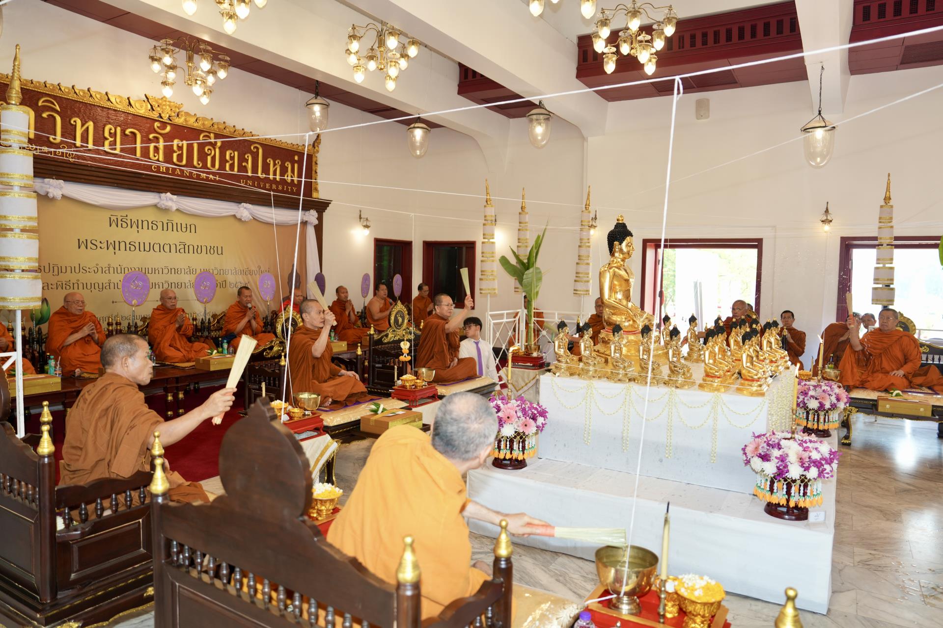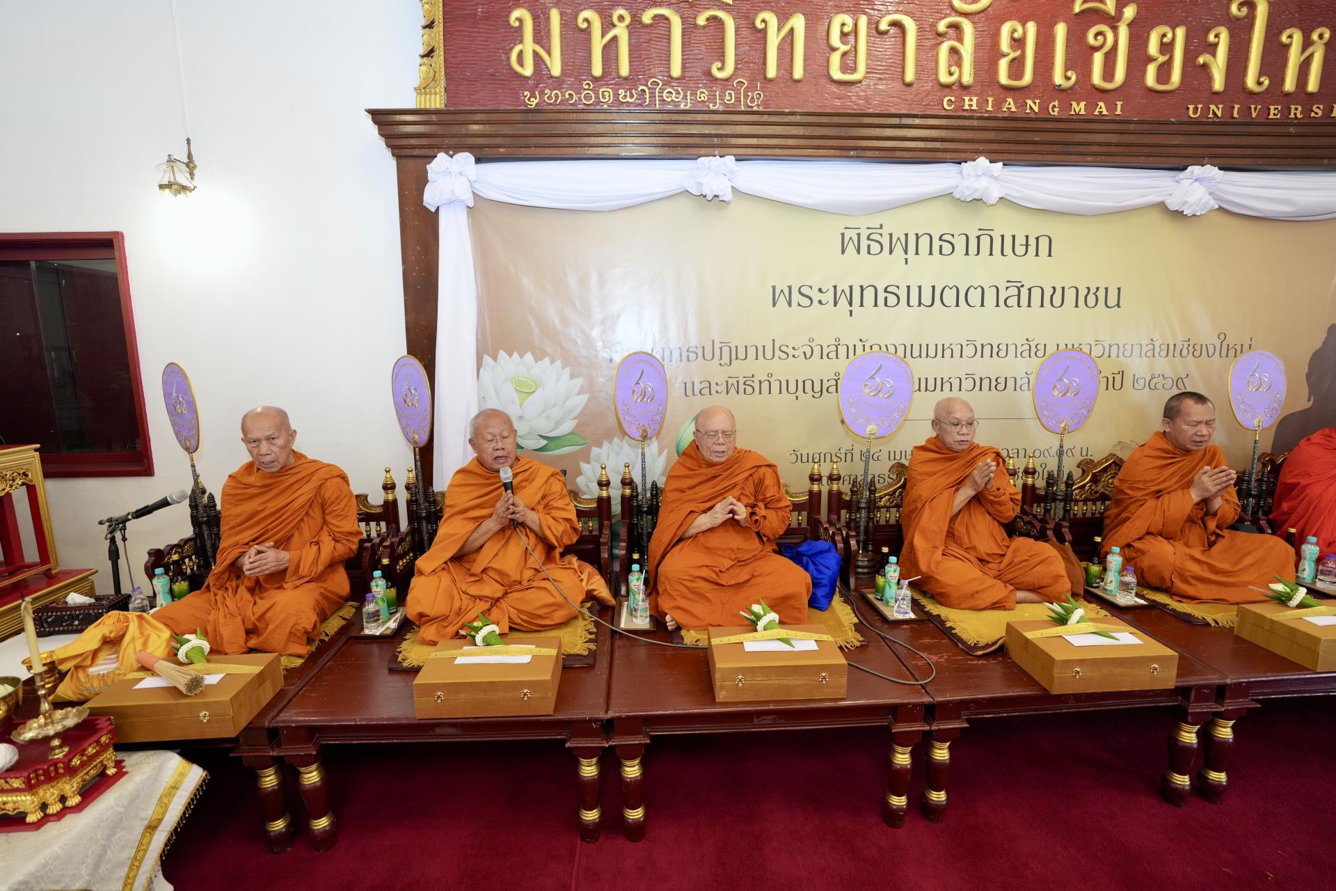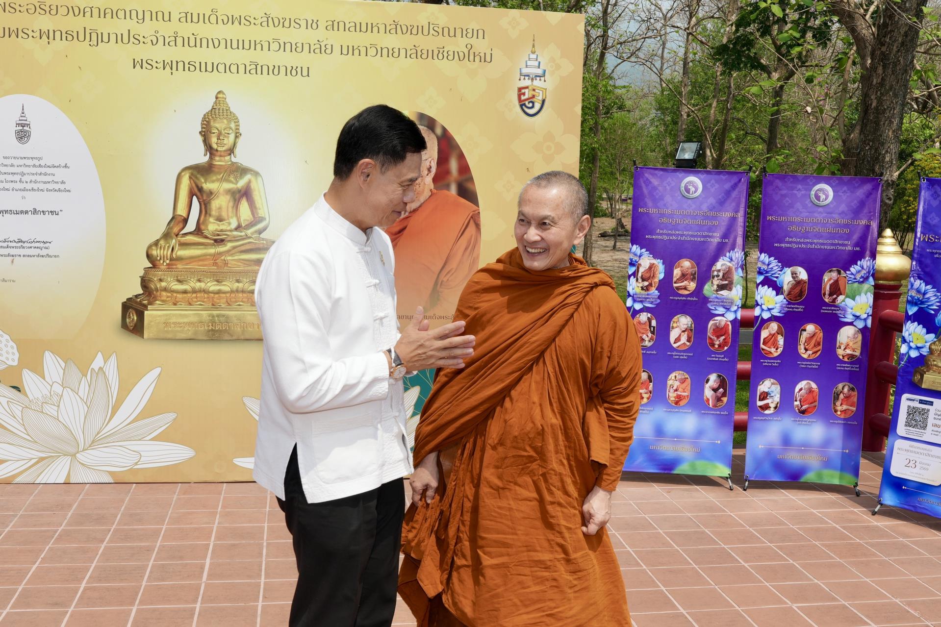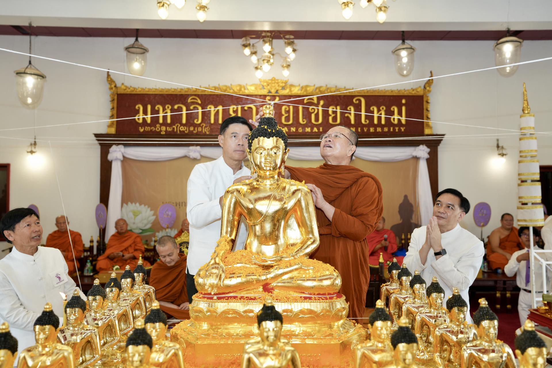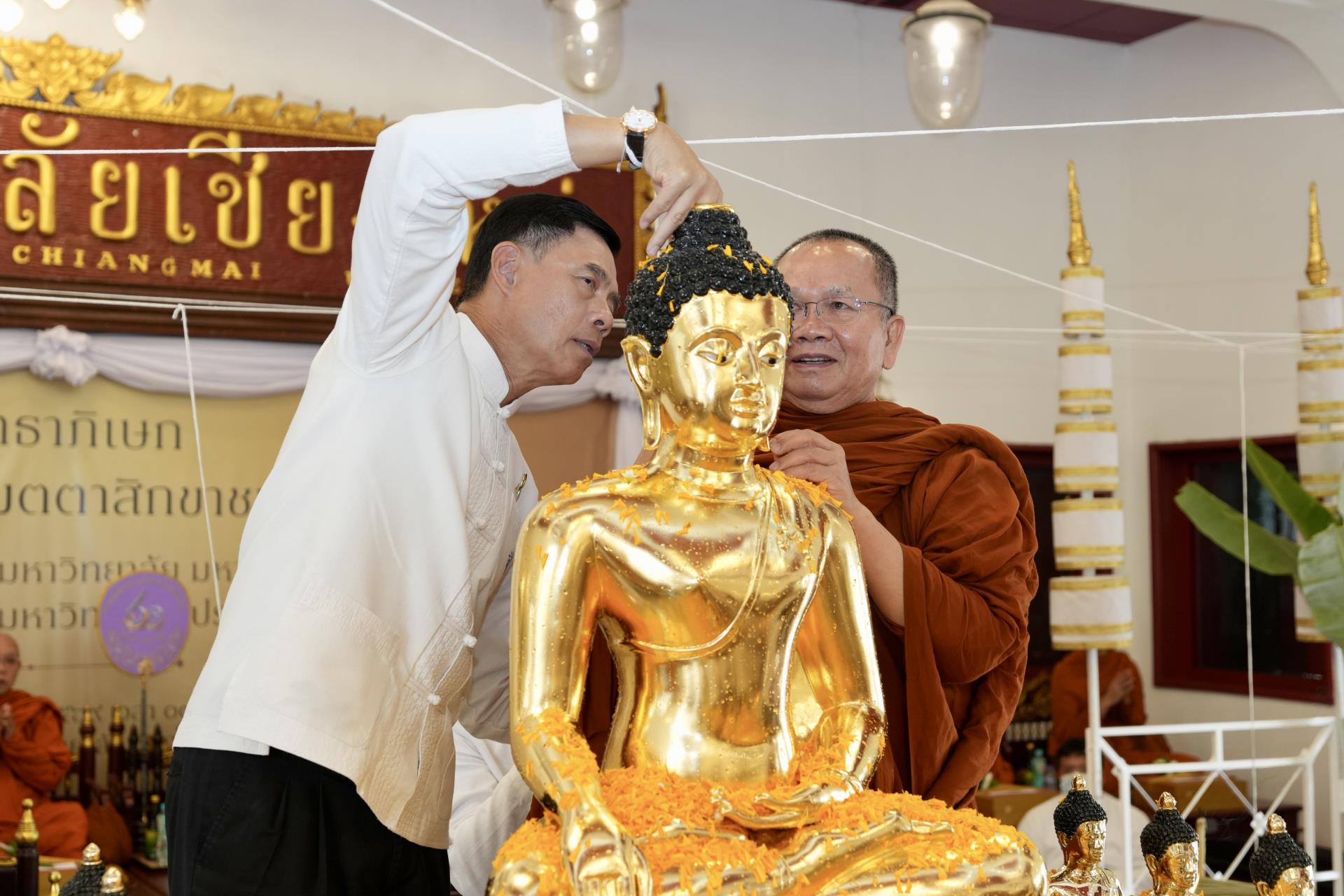 สำนักงานมหาวิทยาลัย ร่วมกับ มหาวิทยาลัยเชียงใหม่ จัดพิธีพุทธาภิเษก “พระพุทธเมตตาสิกขาชน” พระพุทธปฏิมาประจำสำนักงานมหาวิทยาลัย และพิธีทำบุญสำนักงานมหาวิทยาลัย โดยได้รับความเมตตาจาก พระครูสังวรญาณโสภณ (เจริญ ญาณวุฑฺโฒ) เจ้าอาวาสวัดถ้ำปากเปียง อ.เชียงดาว จ.เชียงใหม่ เป็นประธานสงฆ์ และมี ศาสตราจารย์ ดร.นพ.พงษ์รักษ์ ศรีบัณฑิตมงคล อธิการบดีมหาวิทยาลัยเชียงใหม่ เป็นประธานฝ่ายฆราวาสในพิธี เนื่องในประเพณีปี๋ใหม่เมือง ประจำปี 2569 โดยมีคณะผู้บริหาร ผู้อำนวยการและเจ้าหน้าที่ บุคลากร ของสำนักงานมหาวิทยาลัย เข้าร่วมพิธีฯ ณ ศาลาธรรม มหาวิทยาลัยเชียงใหม่ เมื่อวันศุกร์ที่ 24 เมษายน พ.ศ. 2569