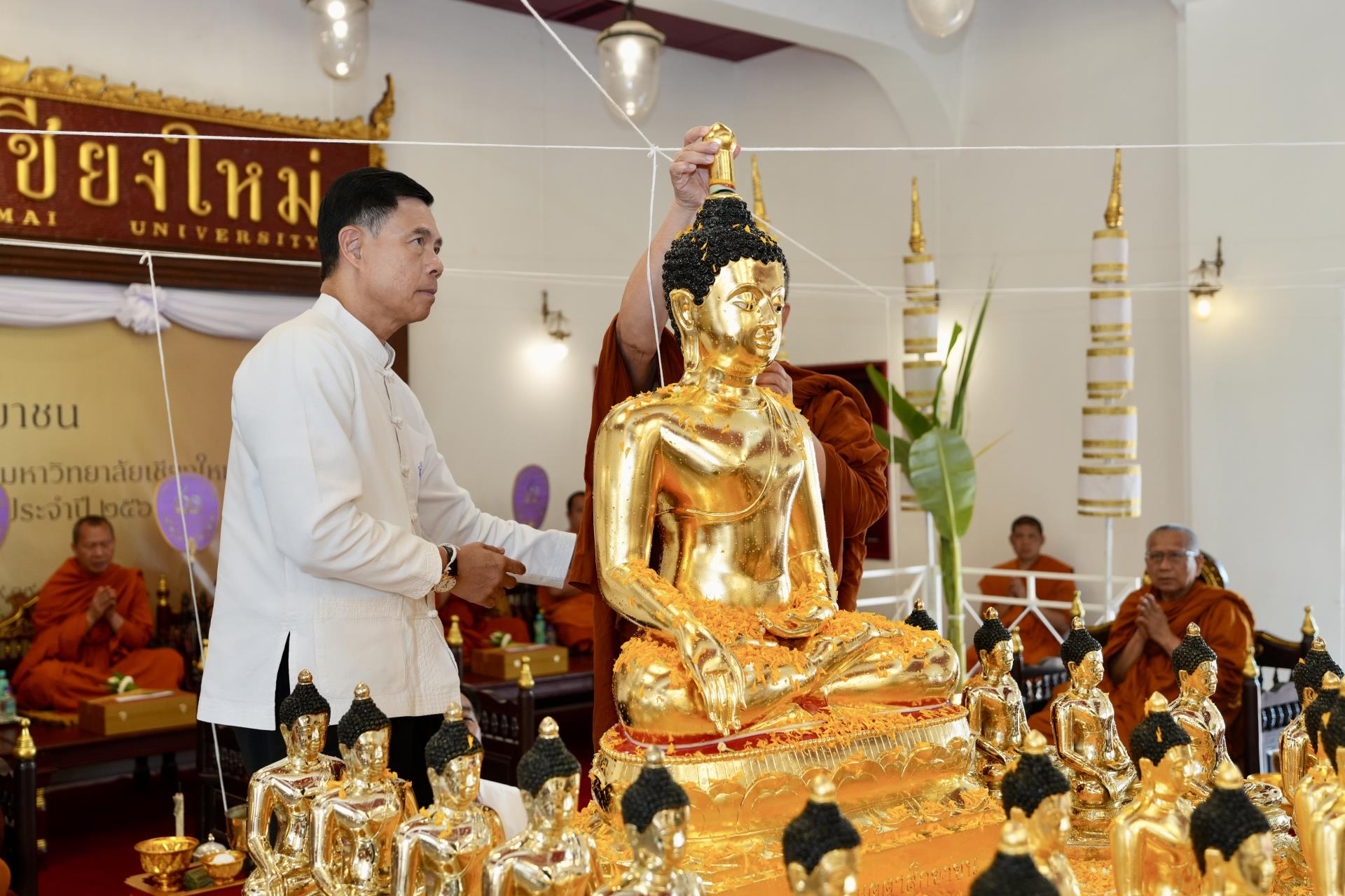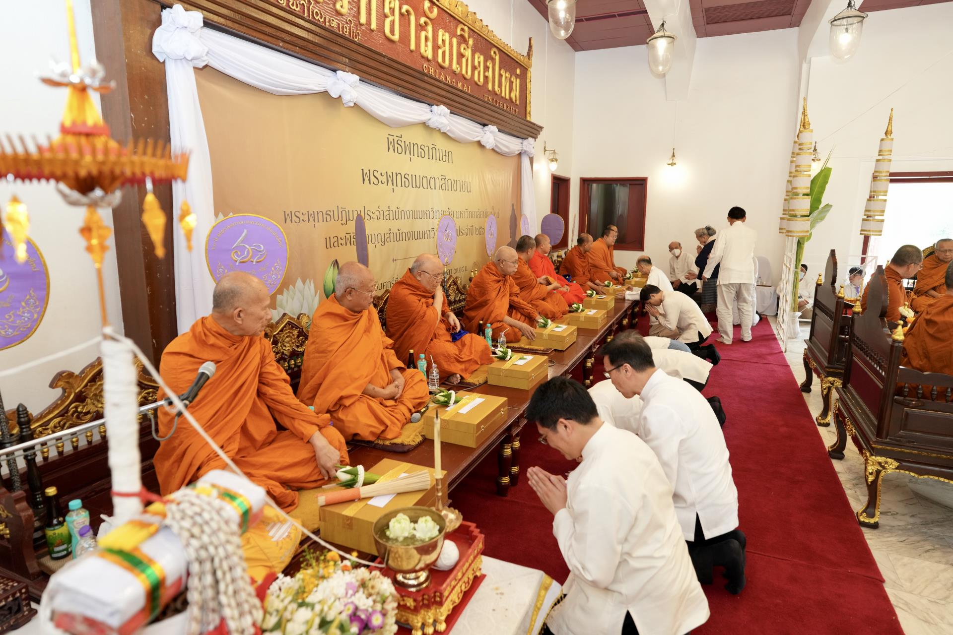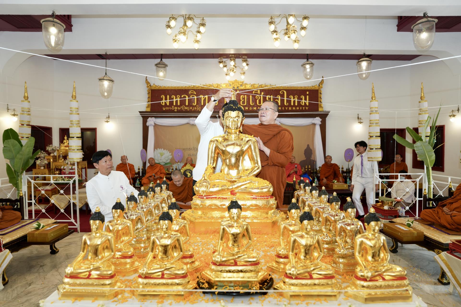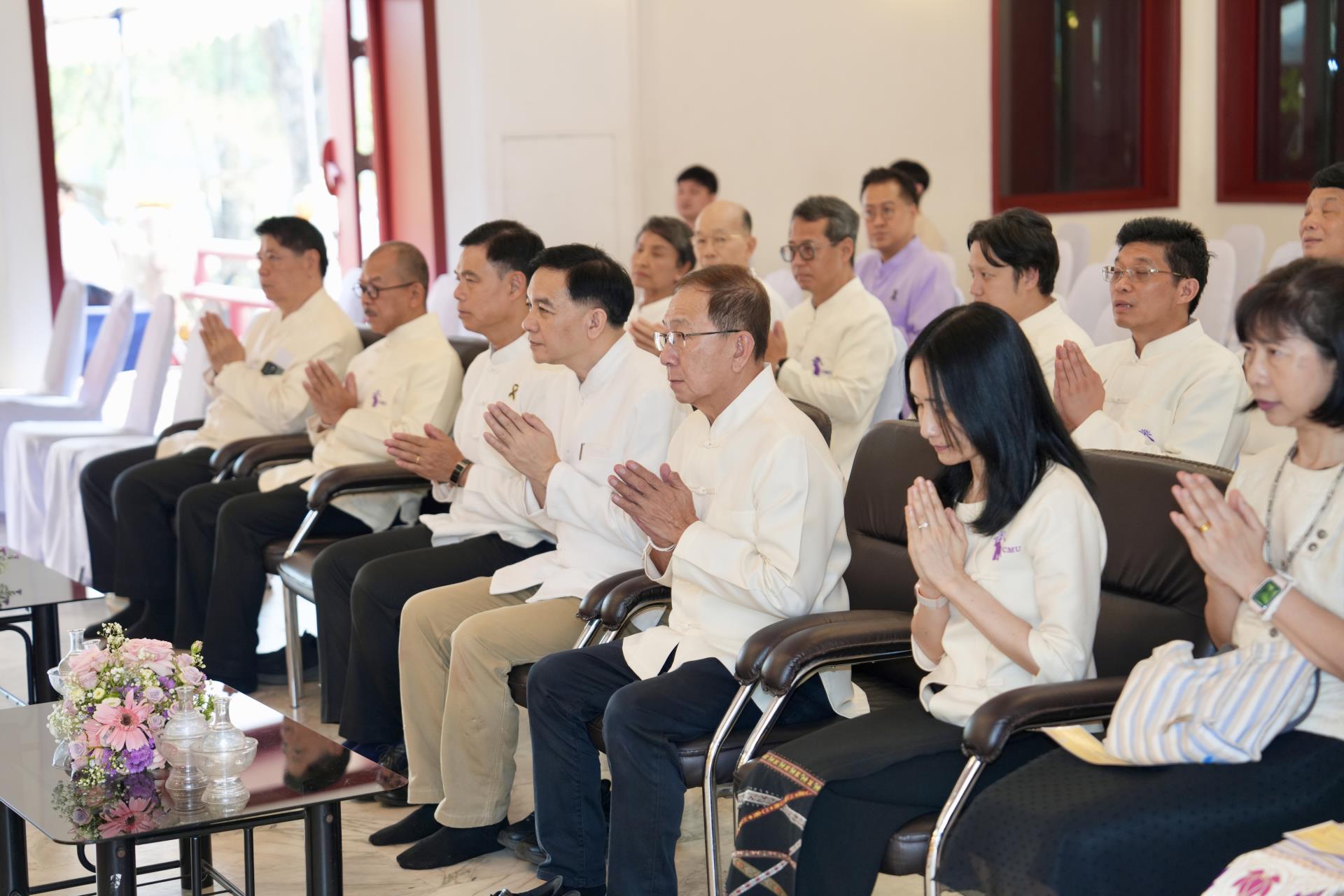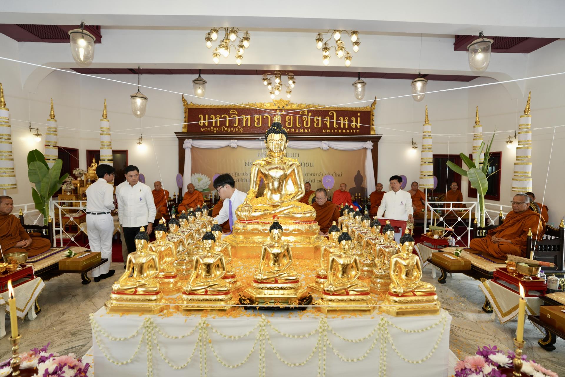 สำนักงานมหาวิทยาลัย ร่วมกับ มหาวิทยาลัยเชียงใหม่ จัดพิธีพุทธาภิเษก “พระพุทธเมตตาสิกขาชน” พระพุทธปฏิมาประจำสำนักงานมหาวิทยาลัย และพิธีทำบุญสำนักงานมหาวิทยาลัย โดยได้รับความเมตตาจาก พระครูสังวรญาณโสภณ (เจริญ ญาณวุฑฺโฒ) เจ้าอาวาสวัดถ้ำปากเปียง อ.เชียงดาว จ.เชียงใหม่ เป็นประธานสงฆ์ และมี ศาสตราจารย์ ดร.นพ.พงษ์รักษ์ ศรีบัณฑิตมงคล อธิการบดีมหาวิทยาลัยเชียงใหม่ เป็นประธานฝ่ายฆราวาสในพิธี เนื่องในประเพณีปี๋ใหม่เมือง ประจำปี 2569 โดยมีคณะผู้บริหาร ผู้อำนวยการและเจ้าหน้าที่ บุคลากร ของสำนักงานมหาวิทยาลัย เข้าร่วมพิธีฯ ณ ศาลาธรรม มหาวิทยาลัยเชียงใหม่ เมื่อวันศุกร์ที่ 24 เมษายน พ.ศ. 2569