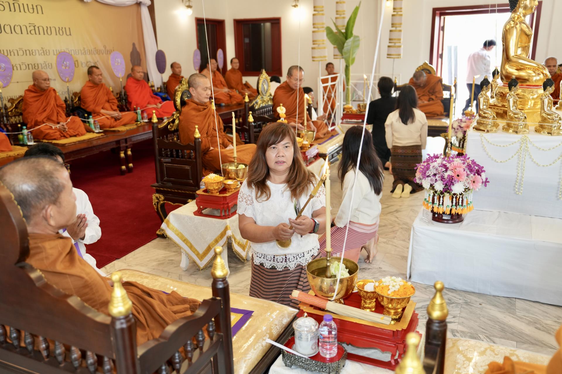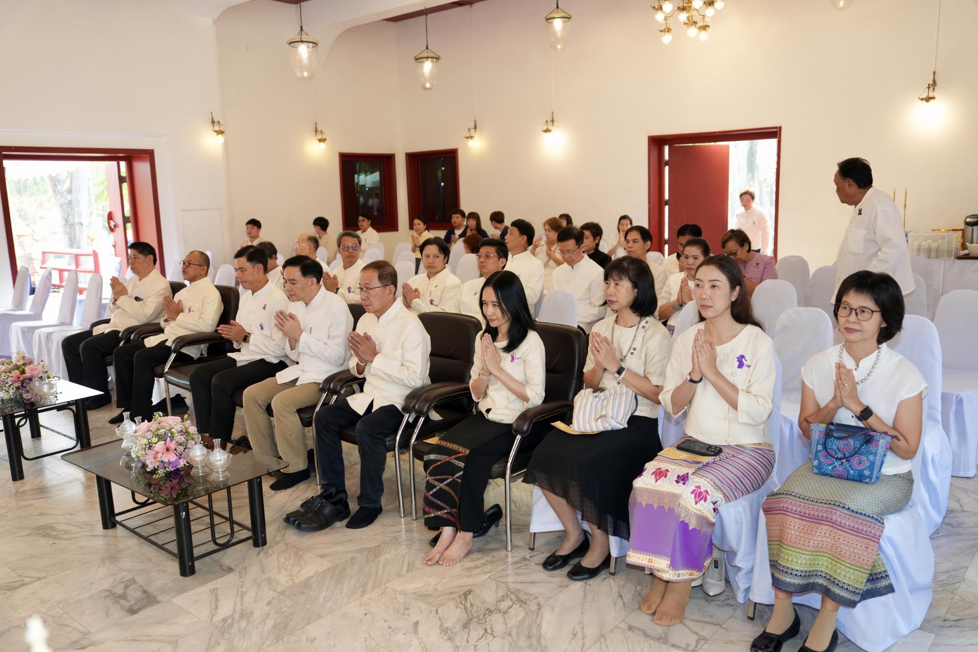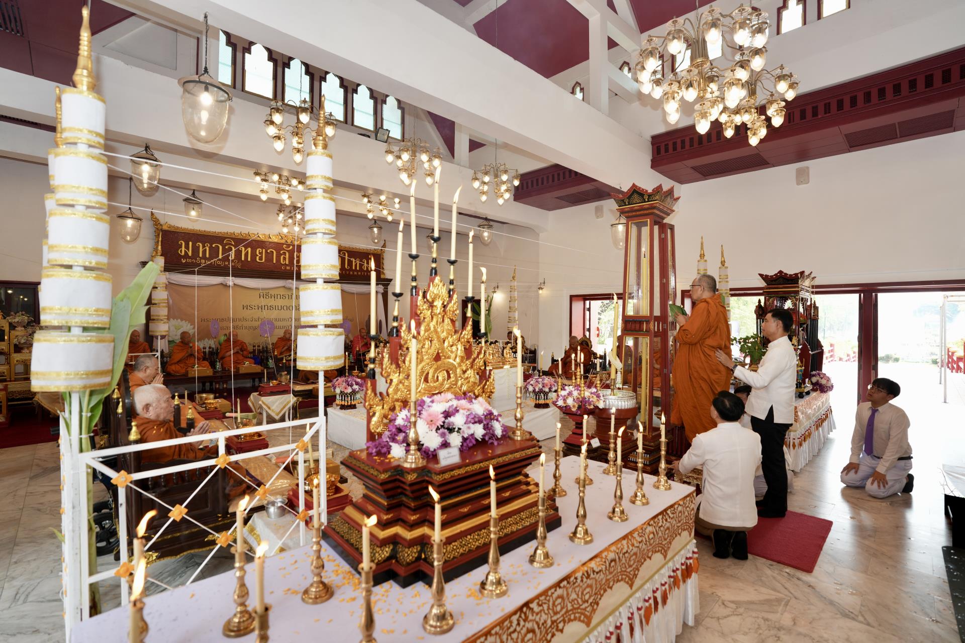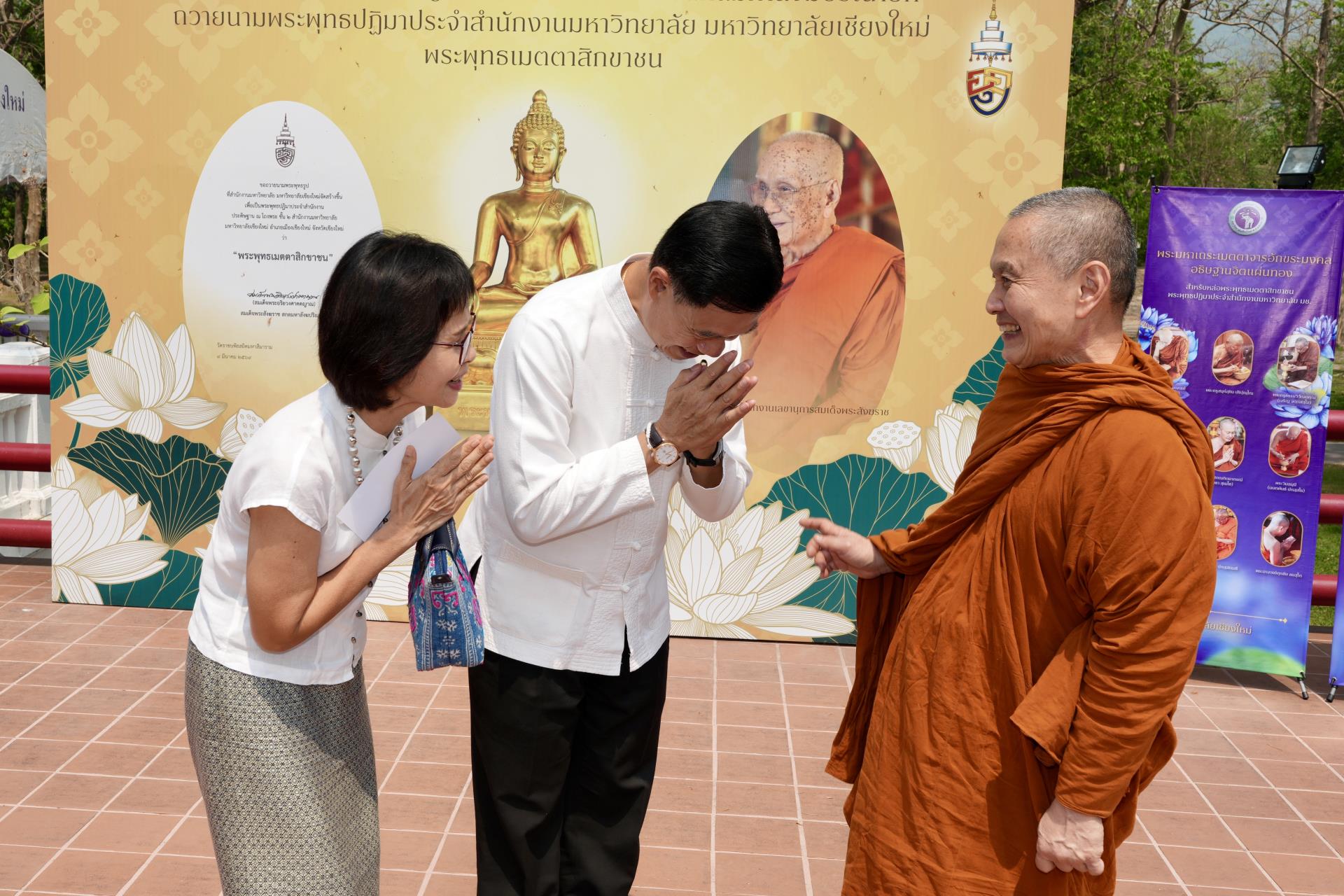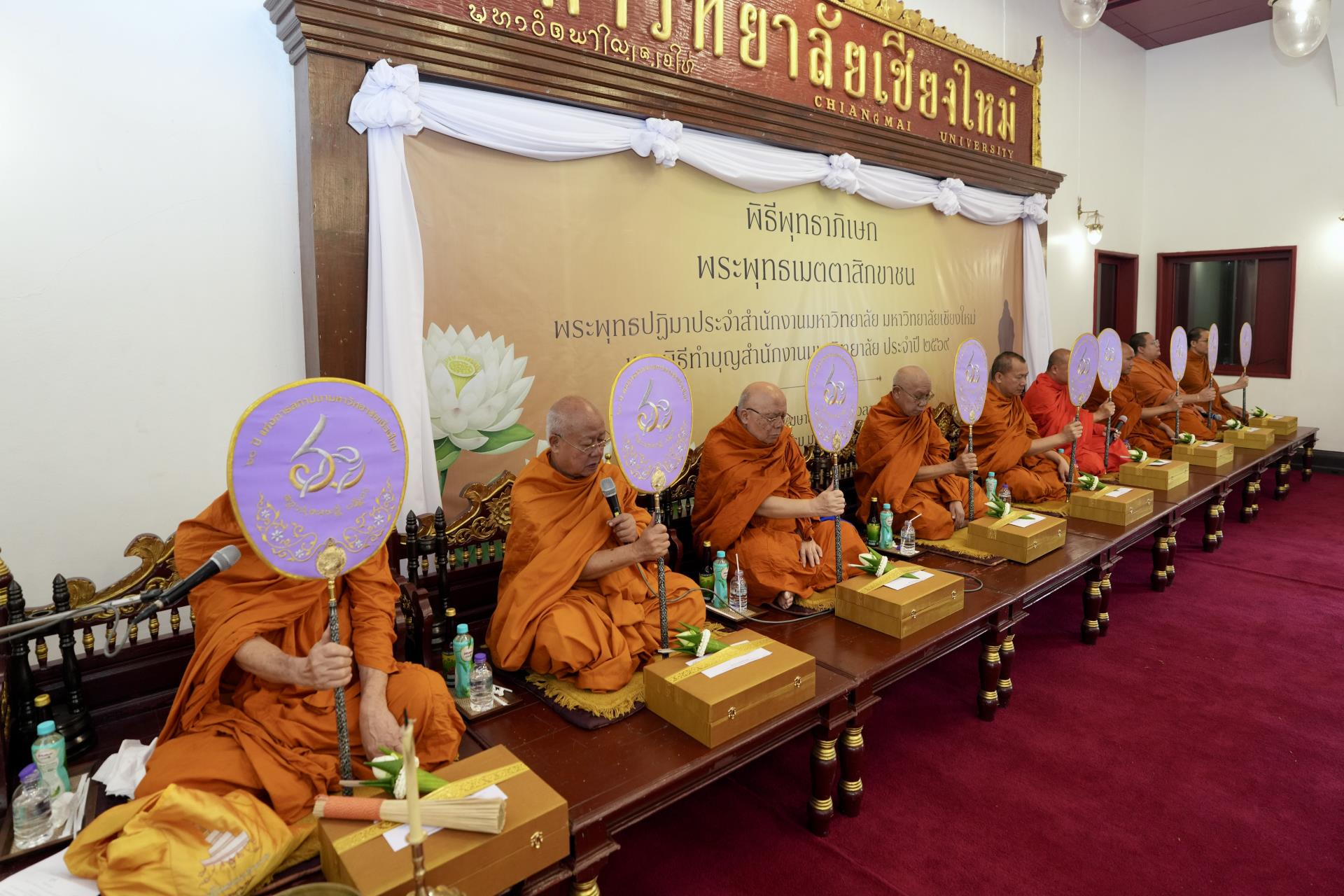 สำนักงานมหาวิทยาลัย ร่วมกับ มหาวิทยาลัยเชียงใหม่ จัดพิธีพุทธาภิเษก “พระพุทธเมตตาสิกขาชน” พระพุทธปฏิมาประจำสำนักงานมหาวิทยาลัย และพิธีทำบุญสำนักงานมหาวิทยาลัย โดยได้รับความเมตตาจาก พระครูสังวรญาณโสภณ (เจริญ ญาณวุฑฺโฒ) เจ้าอาวาสวัดถ้ำปากเปียง อ.เชียงดาว จ.เชียงใหม่ เป็นประธานสงฆ์ และมี ศาสตราจารย์ ดร.นพ.พงษ์รักษ์ ศรีบัณฑิตมงคล อธิการบดีมหาวิทยาลัยเชียงใหม่ เป็นประธานฝ่ายฆราวาสในพิธี เนื่องในประเพณีปี๋ใหม่เมือง ประจำปี 2569 โดยมีคณะผู้บริหาร ผู้อำนวยการและเจ้าหน้าที่ บุคลากร ของสำนักงานมหาวิทยาลัย เข้าร่วมพิธีฯ ณ ศาลาธรรม มหาวิทยาลัยเชียงใหม่ เมื่อวันศุกร์ที่ 24 เมษายน พ.ศ. 2569